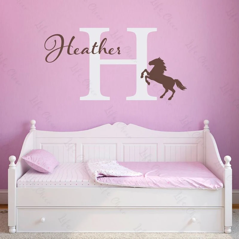 Наклейка на стену с изображением детской лошади, имя, персонализированная наклейка для девочек, декор для спальни с лошадью, большая скачущая наклейка настенные Стикеры с лошадью s