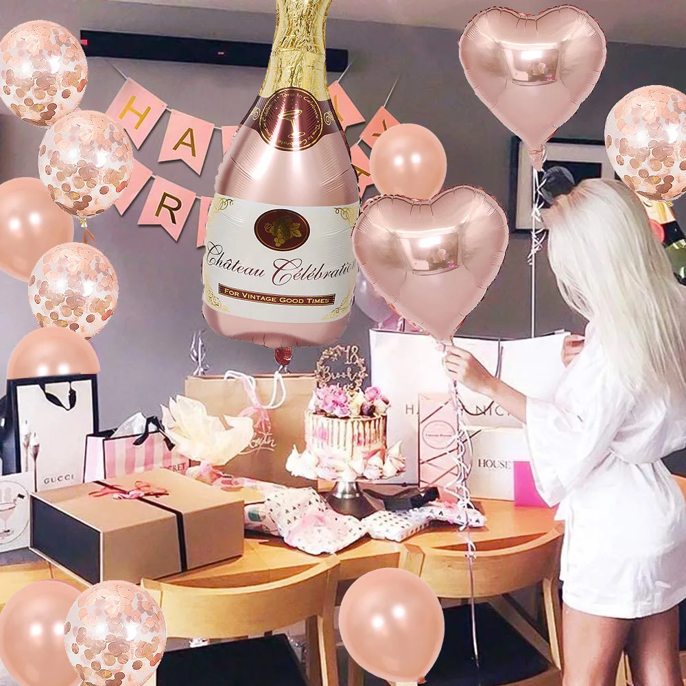 Набор украшений для дня рождения из розового золота, фольгированные шары в форме сердца, большой Кубок шампанского, бумажные помпоны, декор для дня рождения, вечеринки, детей