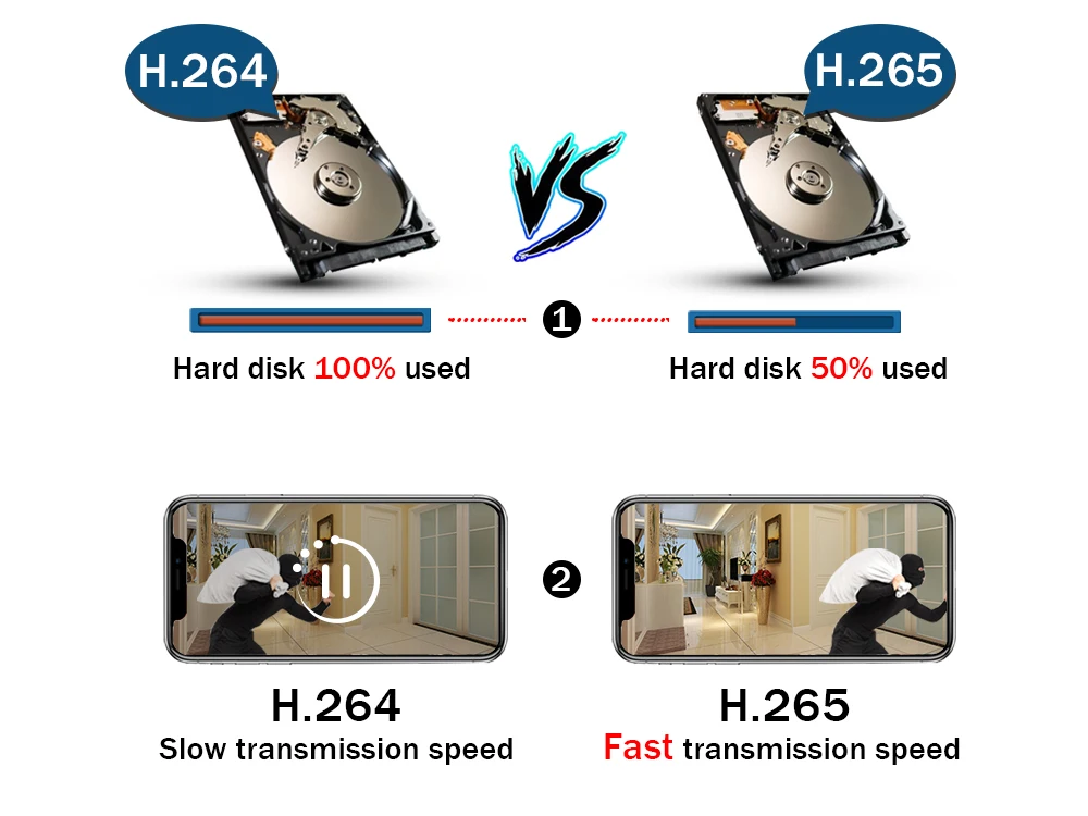 Более четкое H.265, HD разрешение обеспечивает наилучшее качество изображения при более низкой скорости передачи данных.Сэкономьте больше места для хранения, вы можете уменьшить размер файла на 40%-50%,Сэкономьте место на жестком диске и снимите стоимость покупки.