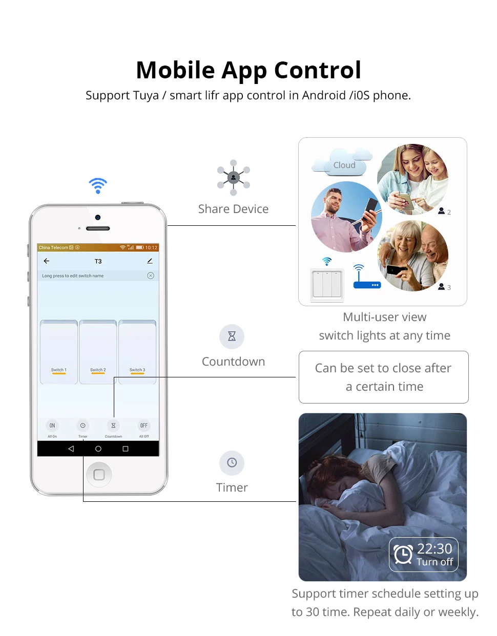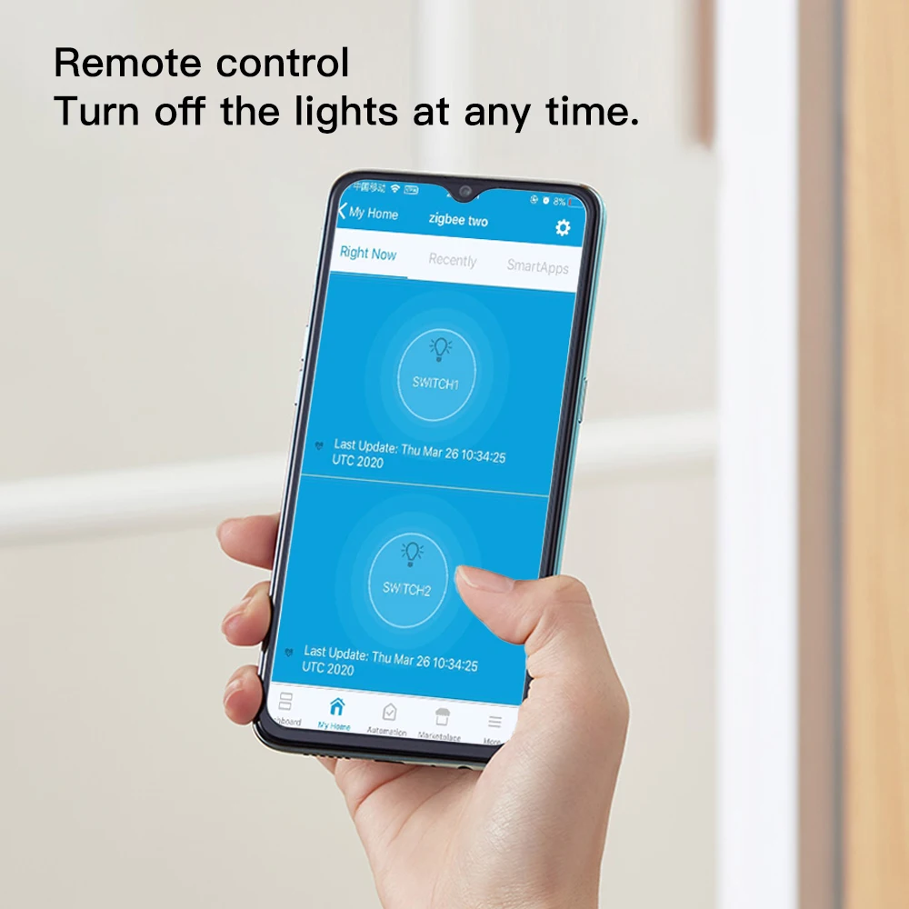 Выключателями умного дома можно управлять удаленно с помощью телефона, а устройства, подключенные к выключателям, могут работать независимо. Даже если вас нет дома, вы можете использовать мобильное приложение для удаленного управления устройством из любого места и управления включением/выключением света в любое время.