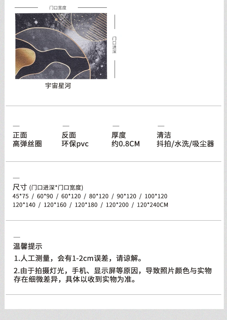 > Этот продукт может быть настроен в соответствии с размером входа, пожалуйста, свяжитесь с нами, если вам нужно настроить. > Он изготовлен из экологически чистого материала и безвреден для людей. > Подошва изготовлена из противоскользящего материала, чтобы предотвратить скольжение коврика и защитить вашу безопасность, верхний материал может поглощать влагу от обуви, чтобы сделать полы чистыми и сухими, также удалите пыль, грязь, снег и т. д. > Его можно свободно разрезать на любые формы, которые вы хотите, и он подходит для внутреннего и наружного входа, прихожей, гостиной, спальни, ванной комнаты и т. д. > Толщина составляет около 8 мм, он может полностью лежать на полу и не будет мешать открыванию и закрытию двери. > Когда он заполнен частицами грязи, вы можете просто очистить его с помощью пылесоса, или вы можете использовать садовый шланг в краску, а затем позволить ему полностью высохнуть на воздухе перед следующим использованием.