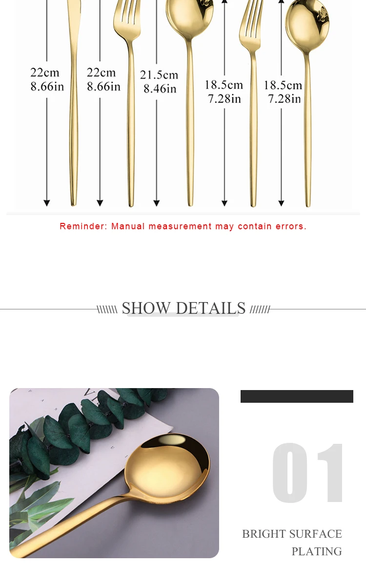 Набор золотых столовых приборов зеркальный из нержавеющей стали 20 шт. набор золотых столовых приборов нож ложка Вилка для обеда кухонная посуда набор столовых приборовОписание:Длина обеденного ножа: 8,66 дюйма-----------------------------------------------------------------------------Длина обеденной ложки: 8,46 дюйма-----------------------------------------------------------------------------Длина обеденной вилки: 8,66 дюйма-----------------------------------------------------------------------------Длина десертной ложки: 7,28 дюйма-----------------------------------------------------------------------------Длина десертной вилки: 7,28 дюйма-----------------------------------------------------------------------------