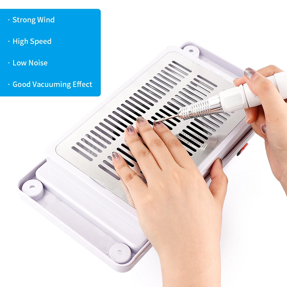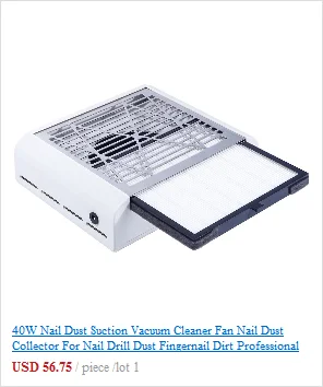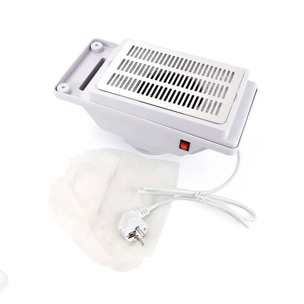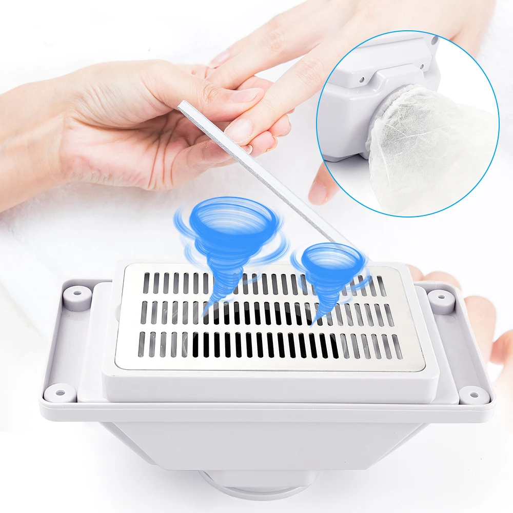 ХарактеристикаНастольный дизайн. Подходит для маникюрного столаНизкий уровень шума и простота в эксплуатацииСильный вентилятор для сбора пыли, создаваемой во время подачи или полировки ногтейУпаковка включает 1 шт мешка для пыли, который можно поменять и помытьС мощным и тихим двигателем, удобным в использованииШироко используется в процессе ухода за ногтями, таких как полировка/маникюр/палочка для ногтей и так далее.Используется в профессиональных салонах красоты, но также может использоваться в домашних условиях.