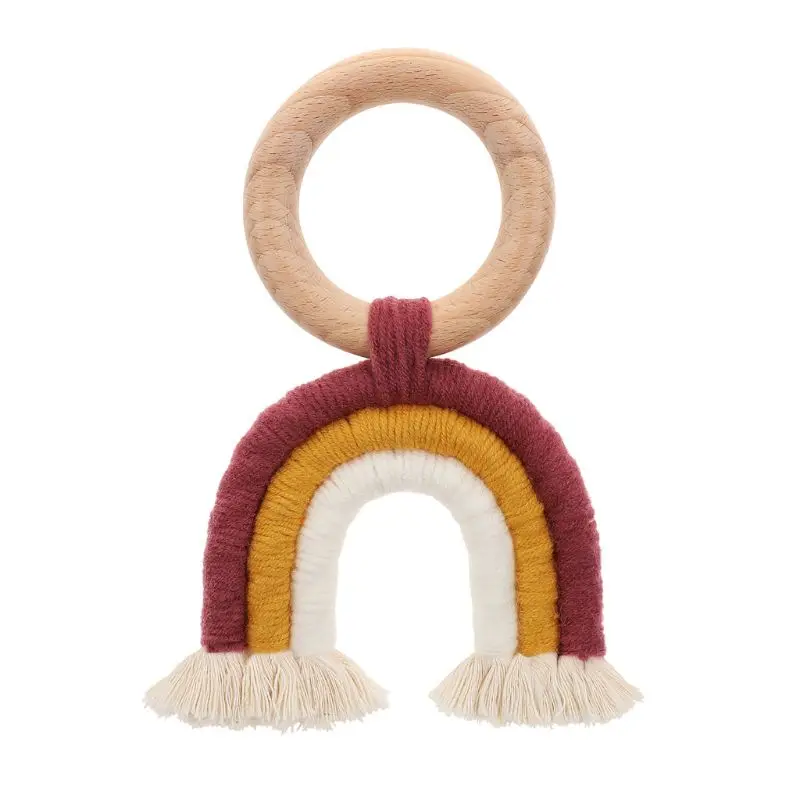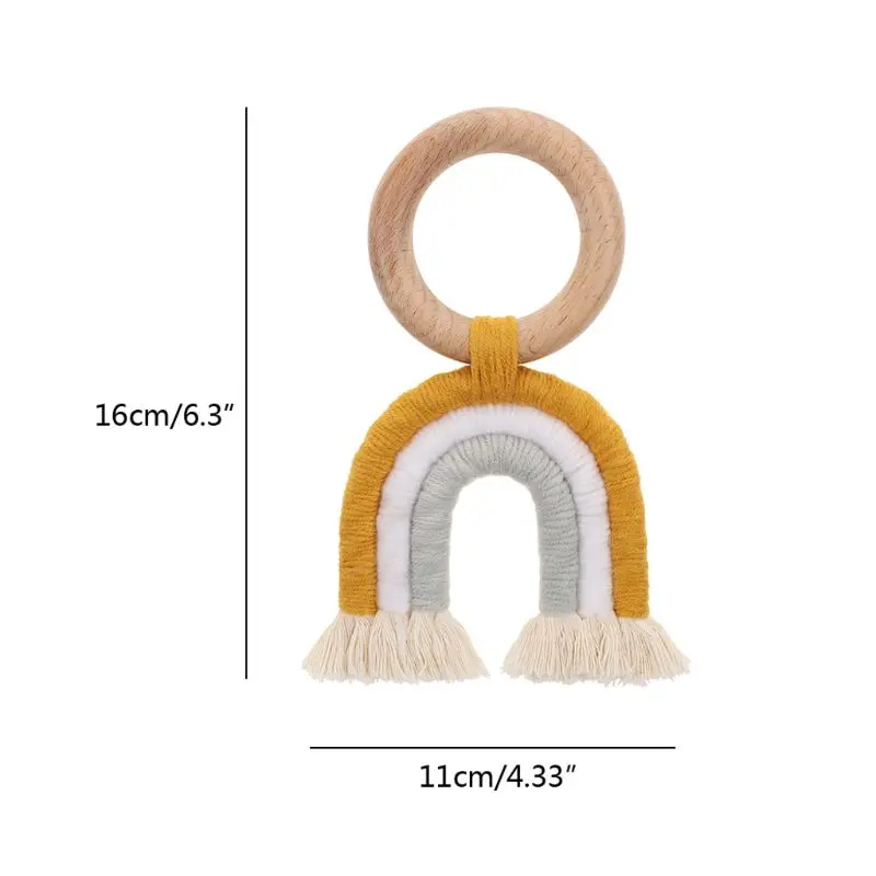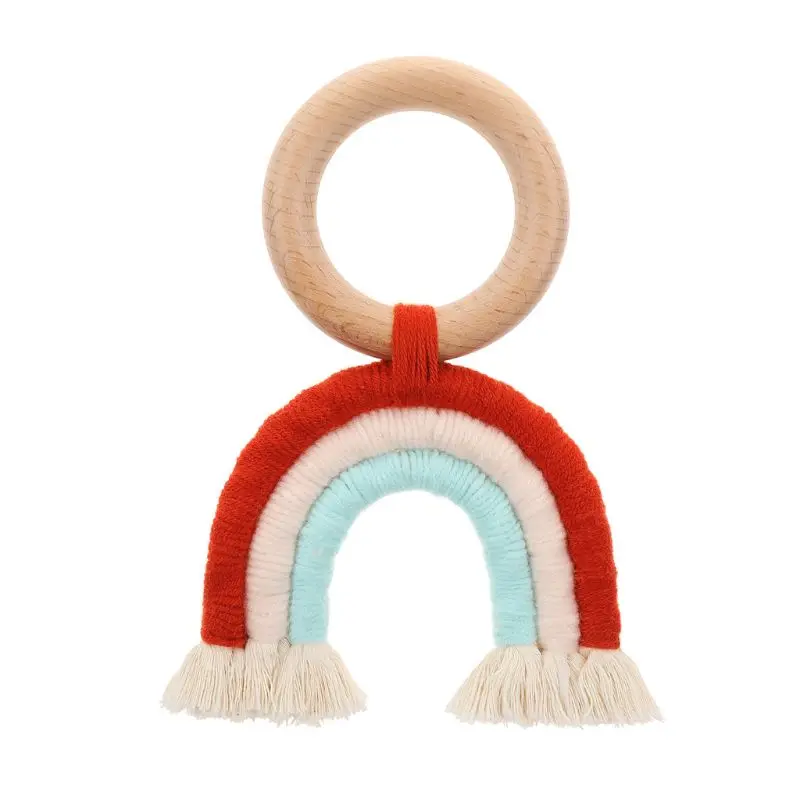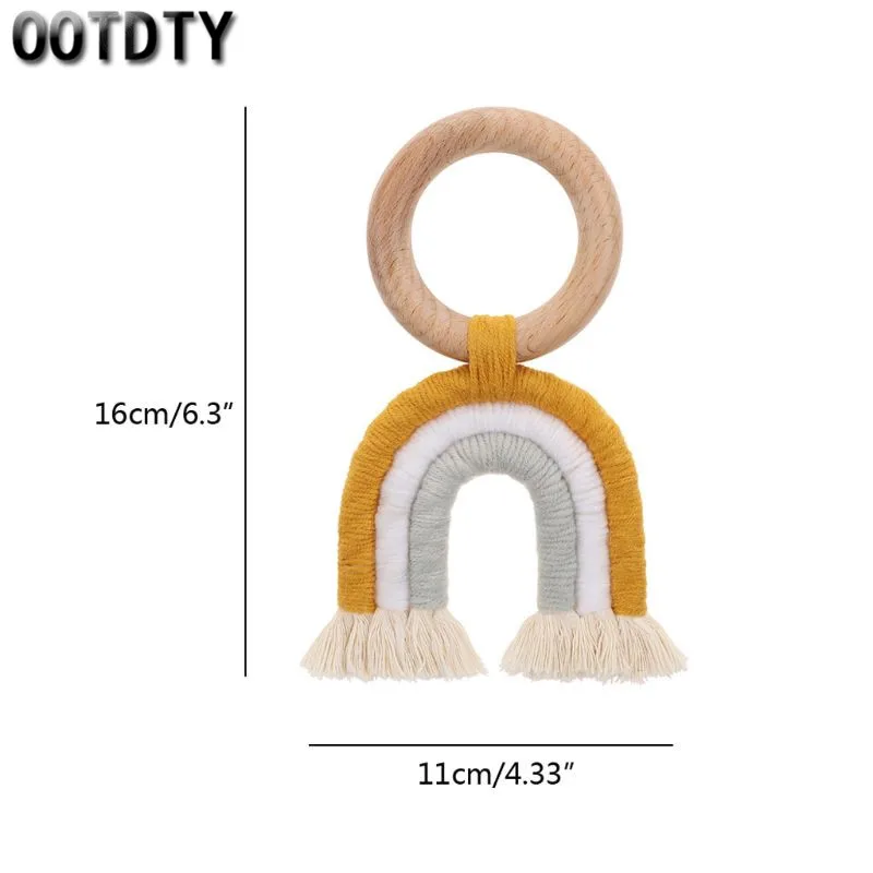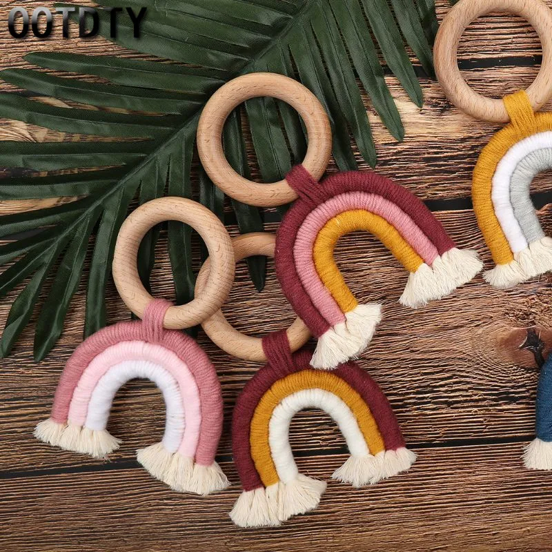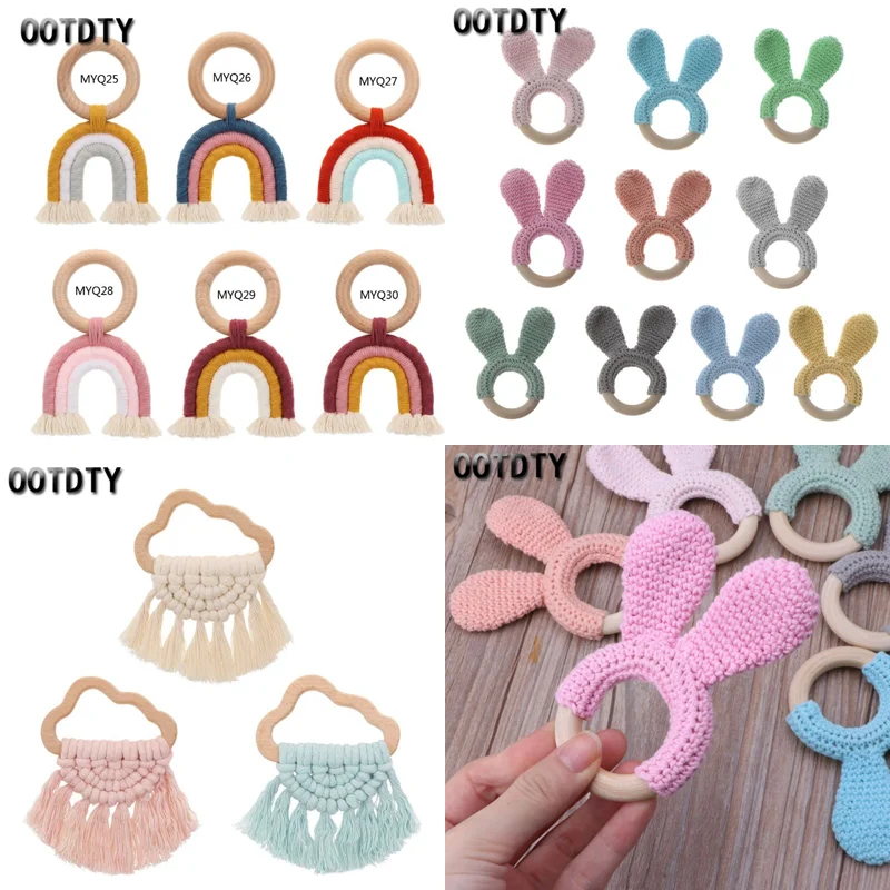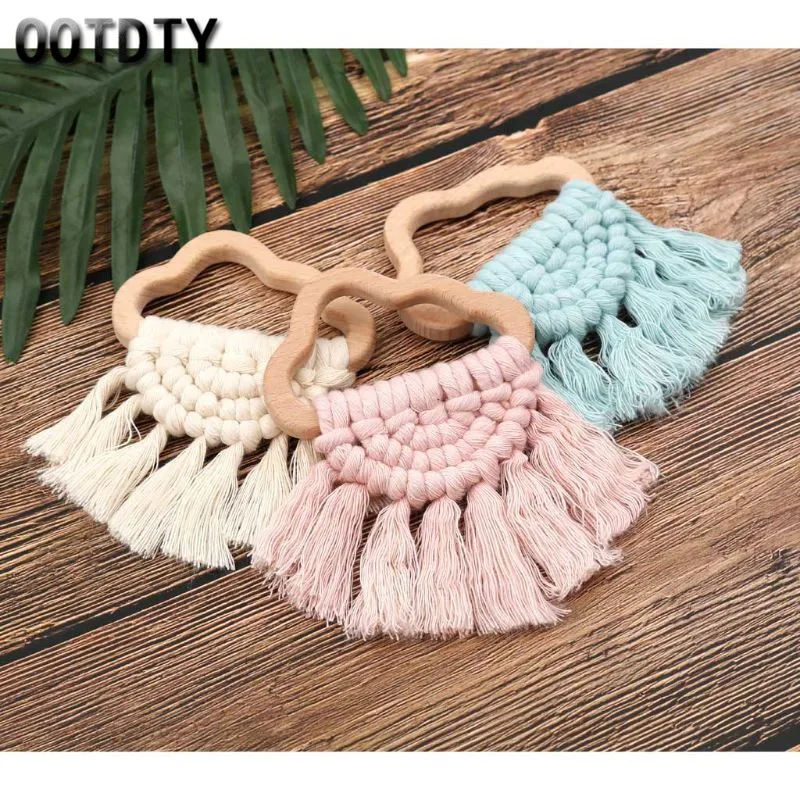 Деревянное натуральное вязаное крючком детское Прорезыватель для зубов, кольцо для прорезывания зубов, браслет с радужной кисточкой, детский Прорезыватель зубов