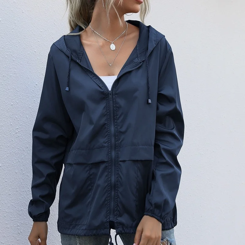 Женская Весенняя куртка с капюшоном на молнии, уличный водонепроницаемый дождевик для походов, куртки, свободные пальто, спортивное пальто для бега, велосипеда, черное 2021