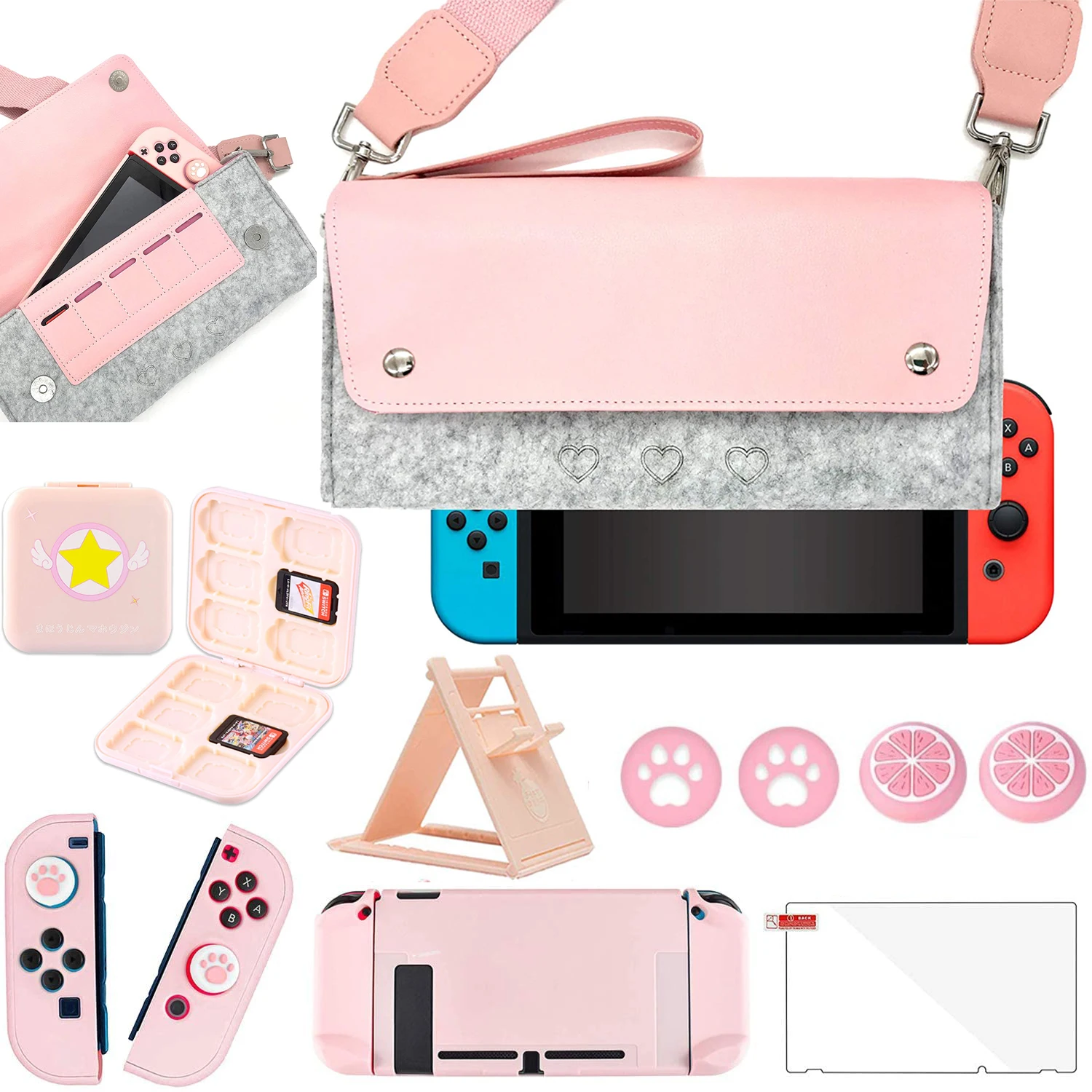 10 в 1, розовый комплект аксессуаров для Nintendo Switch, чехол для переноски, противоударный чехол для путешествий, Сумка с игровой подставкой, чехол для карт, захваты для большого пальца, защита для экрана, плечо для выключателя Joy-Con & аксессуары