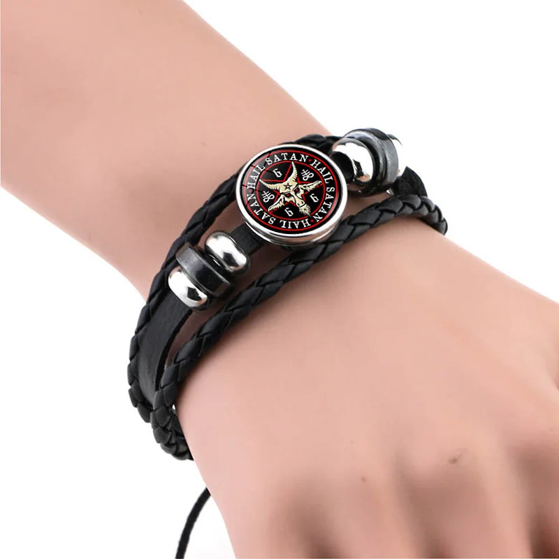Сатанизм готика красный козьей головы плетеный браслет перевернутая пентаграмма Бафомет печати стекло драгоценный камень ручной работы плетеный панк кожаный браслет