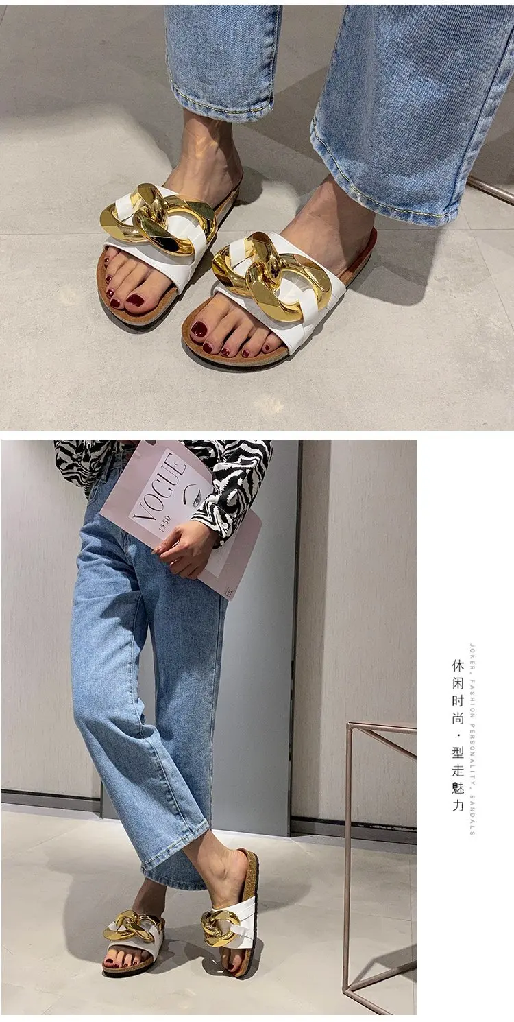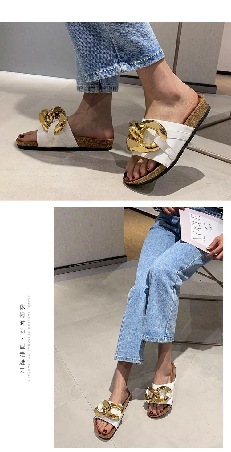 Шлепанцы женские, летние, из замши, резины, с открытым носком, на плоской подошве, с цепочкой, 2021