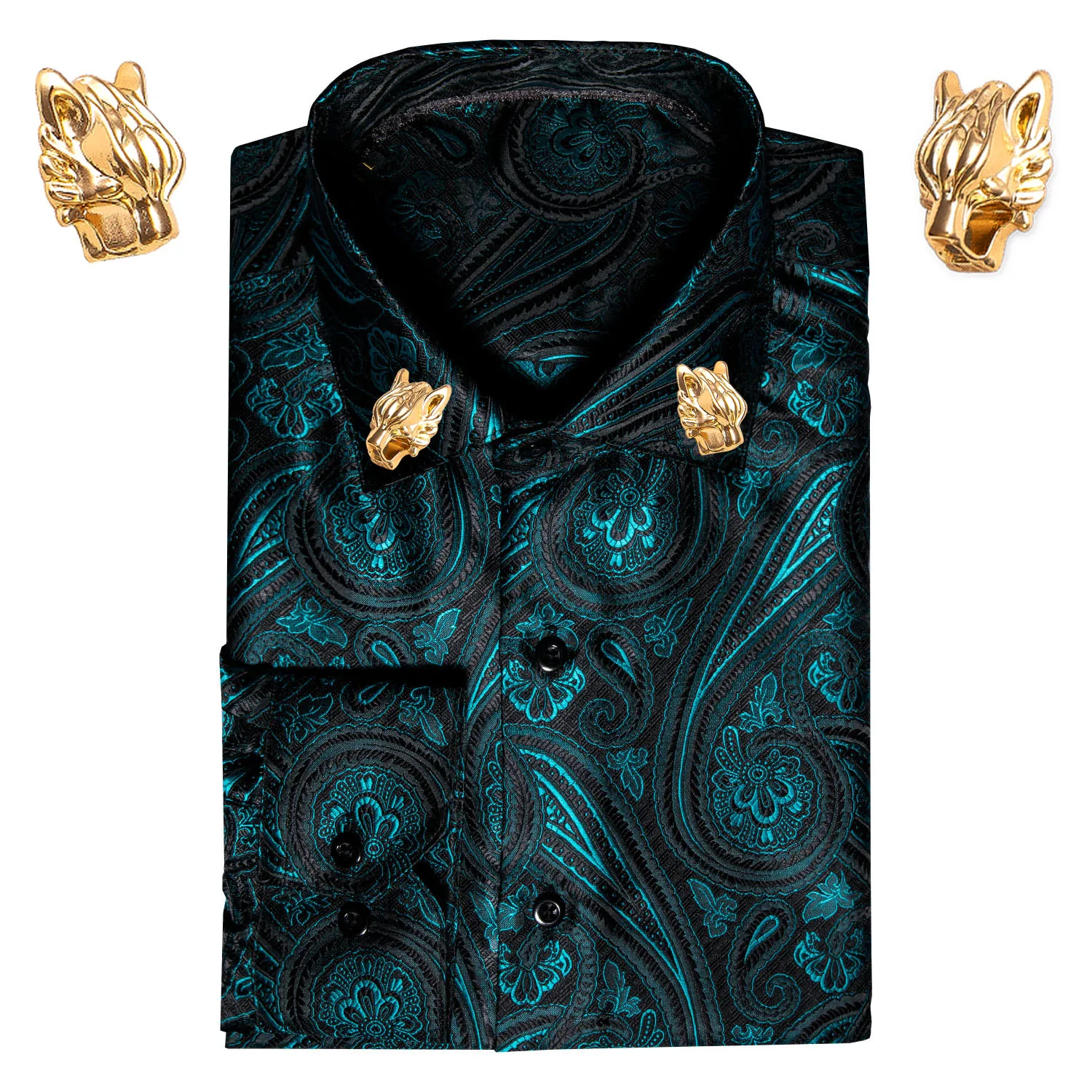 Barry.Wang бирюзовые шелковые рубашки с пейсли, мужские повседневные рубашки с длинным рукавом, дизайнерская приталенная рубашка с золотым леопардовым воротником