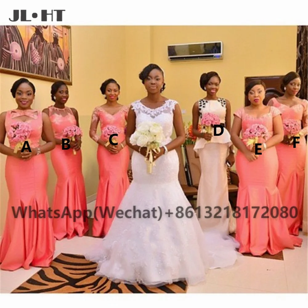 Длинные Атласные Платья для подружек невесты, кораллового цвета, 2021, с кружевными аппликациями, для свадьбы, черного цвета, размера плюс, платье подружки невесты из Африканской ткани
