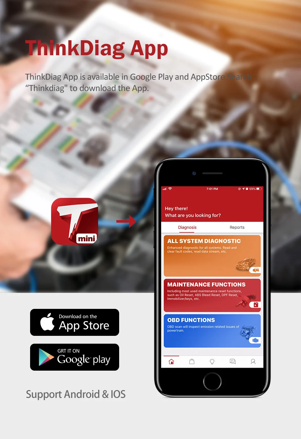 ThINKCAR ThinkDiag mini-это портативный, экономичный инструмент для диагностики неисправностей автомобиля, подходящий для личных пользователей и небольших ремонтных магазинов DIY. Включает в себя все функции диагностики системы автомобиля и 15 видов специальных функций сброса. ThinkDiag mini состоит из диагностического разъема и приложения. Он подключается к диагностическому сидению транспортного средства через разъем и поддерживает smart autoVIN беспроводную связь со смартфоном или планшетом через Bluetooth, так что клиентское программное обеспечение и диагностическое программное обеспечение могут быть установлены на смарт-Терминале для диагностики неисправности автомобильной электронной системы. ThinkDiag Mini предоставляет профессиональные диагностические отчеты. После диагностики, полный диагностический отчет будет автоматически генерироваться, чтобы четко понять любую неисправность транспортного средства. Вы также можете поделиться отчетом в общине, facebook, twitter, чтобы облегчить обмен информацией и обсуждение с друзьями.