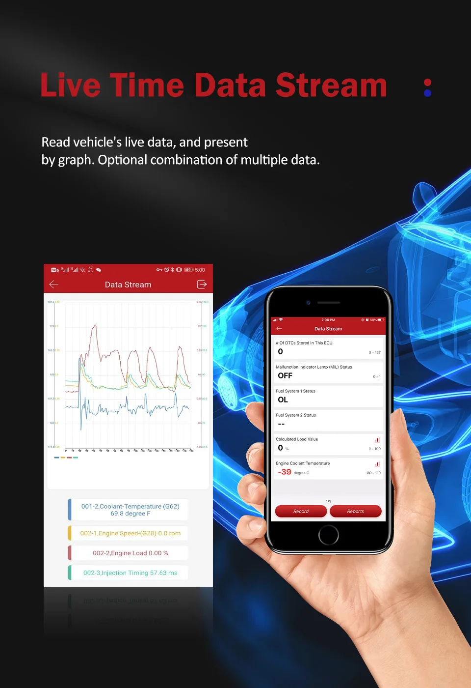 Эта опция позволяет определить, являются ли Системные параметры нормальными или нет. В основном включает приводную систему, систему шасси, систему кузова, электрическую систему. Считывание и стирание кодов для всех доступных систем, выключение светильник MIL (индикатор-светильник), отображение данных в реальном времени в текстовом, графическом и аналоговом формате для удобного просмотра данных.