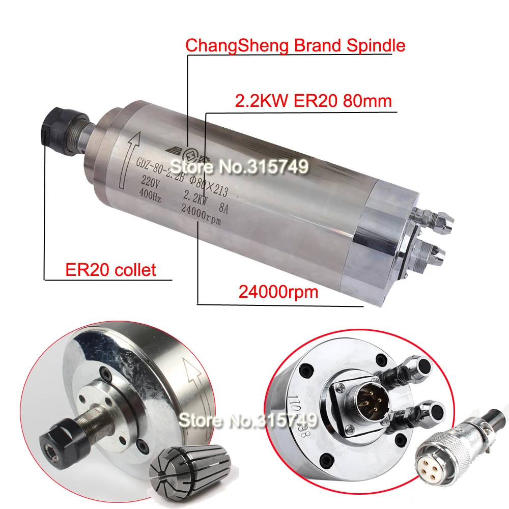 Мощность: 2200 ВтНапряжение: 220 ВЧастота: 0-400 ГцСкорость: 0-24000 об/минВодяное охлаждение ER20 colletВЫКЛ: менее 0,005 ммГермания SKS 4 шт подшипникСмазка для смазки