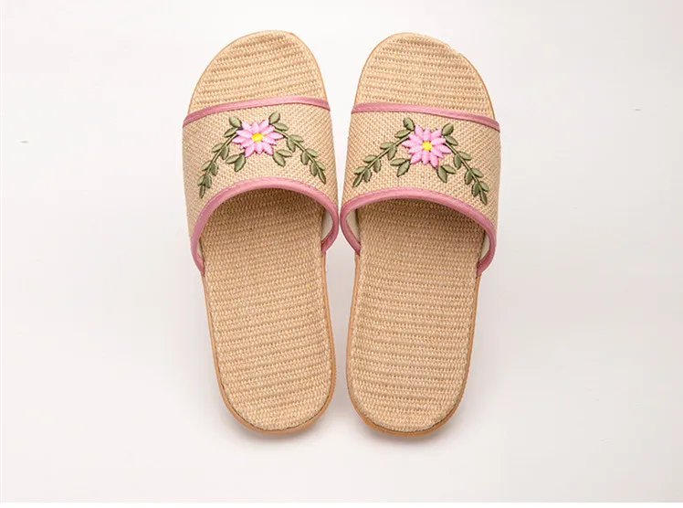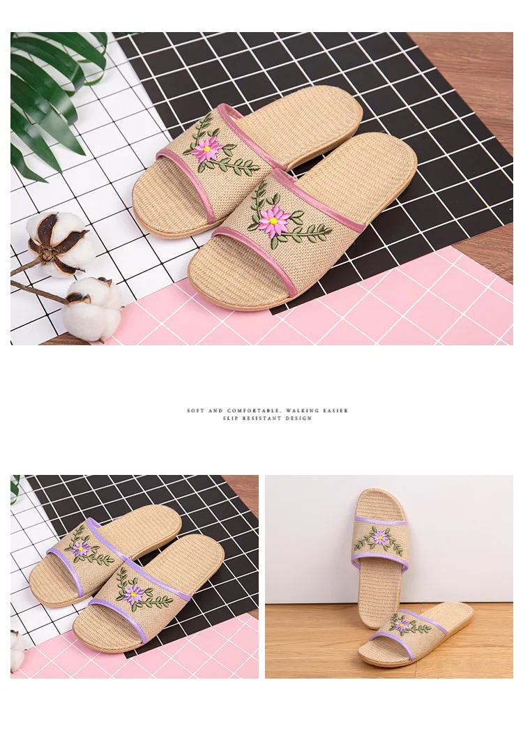 Suihyungженская летняя домашняя обувь мягкие Нескользящие тапочки льняные повседневные шлепанцы с цветочной вышивкой плоские сандалии женские льняные вьетнамки