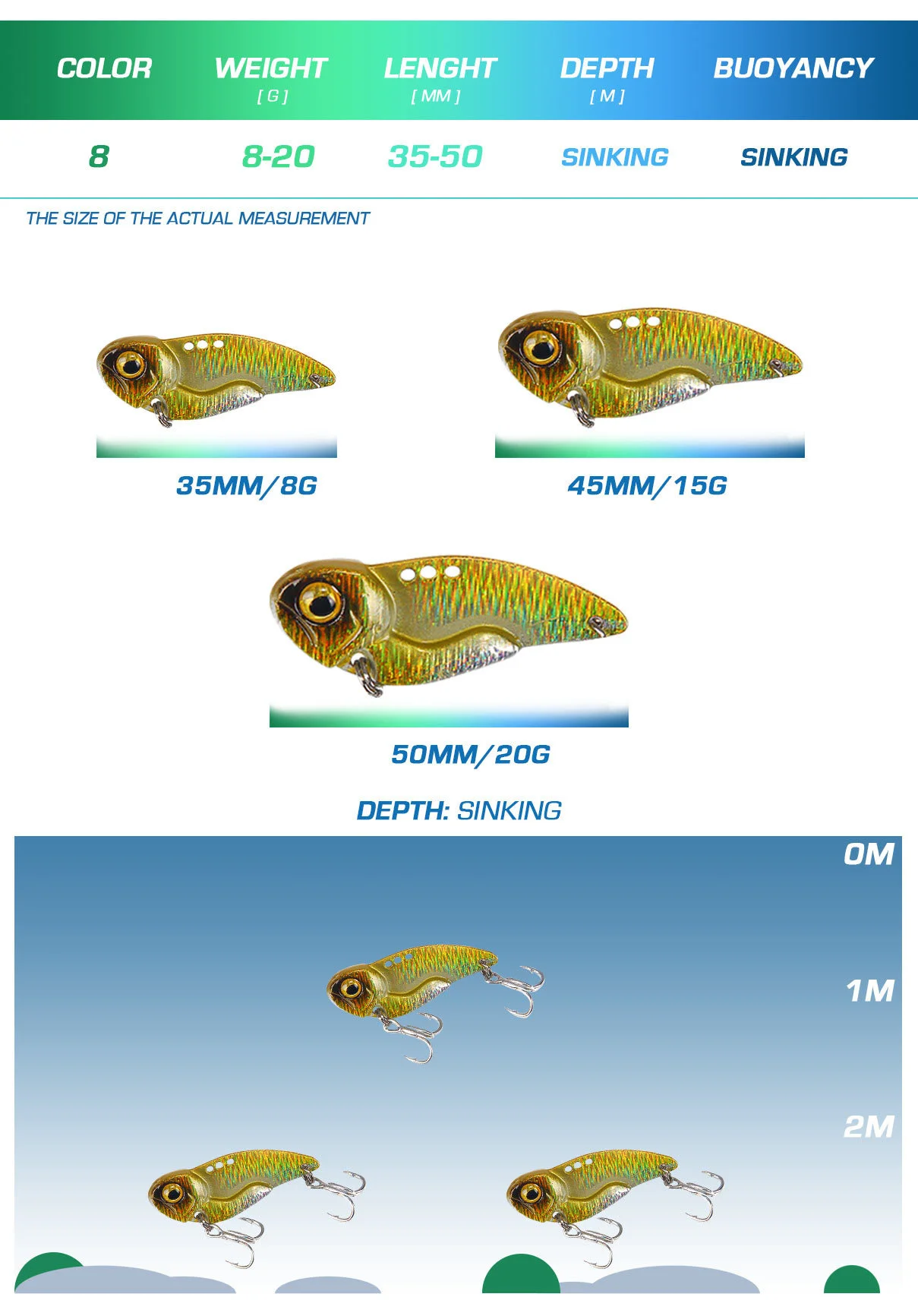 Информация о продукте:Бренд: WAVEISLAND Модель приманки: VIB Тип приманки: жесткая рыболовная приманка Вес приманки: 8-20 г Длина приманки: 35-50 мм Глубина погружения: полный слой воды Плавучесть: погружение Крючки: оснащены антикоррозийными крючками Глаза: 3D рыбий глаз Кольца: велосипедные Цвета: 8 цветов