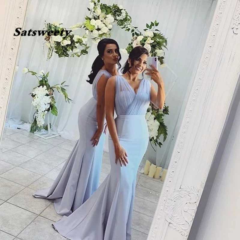 Женское длинное атласное платье-Русалка, привлекательное светло-голубое платье подружки невесты без рукавов, с V-образным вырезом, для свадебной вечеринки, 2021