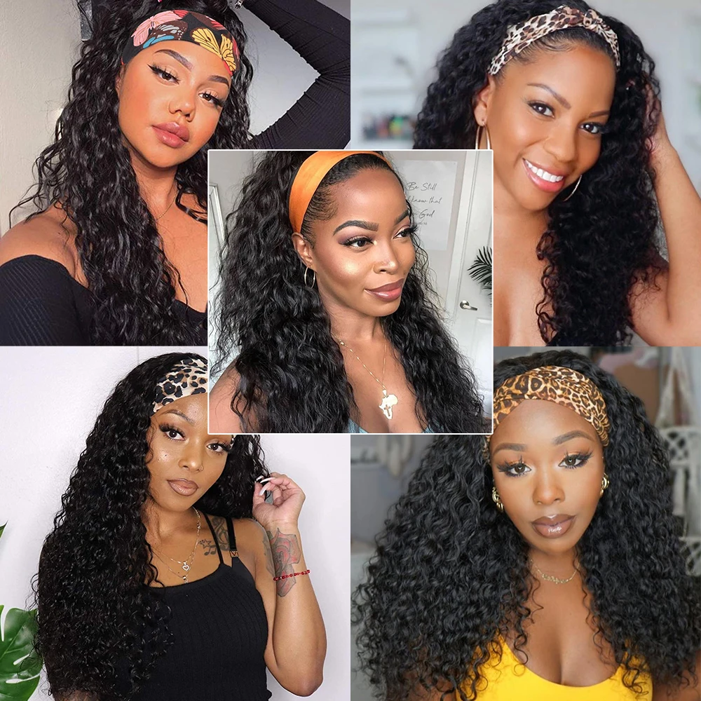 Искусственные волосы для чернокожих женщин, глубокие волнистые парик с головной повязкой, бразильские кудрявые парики для чернокожих женщин, машинная работа, манекен для шарфа парика без клея