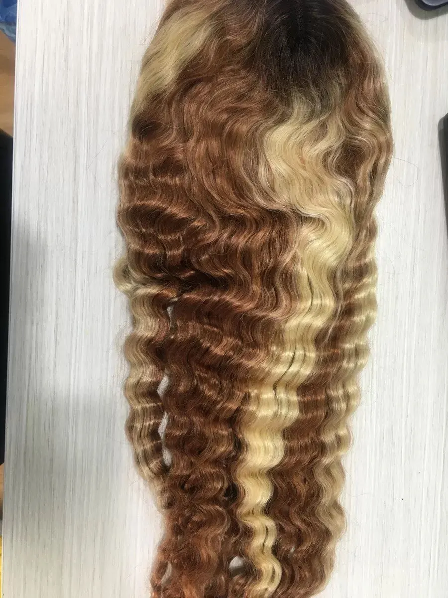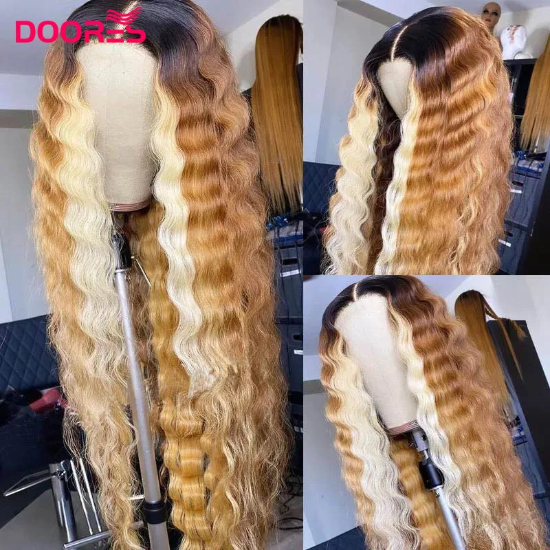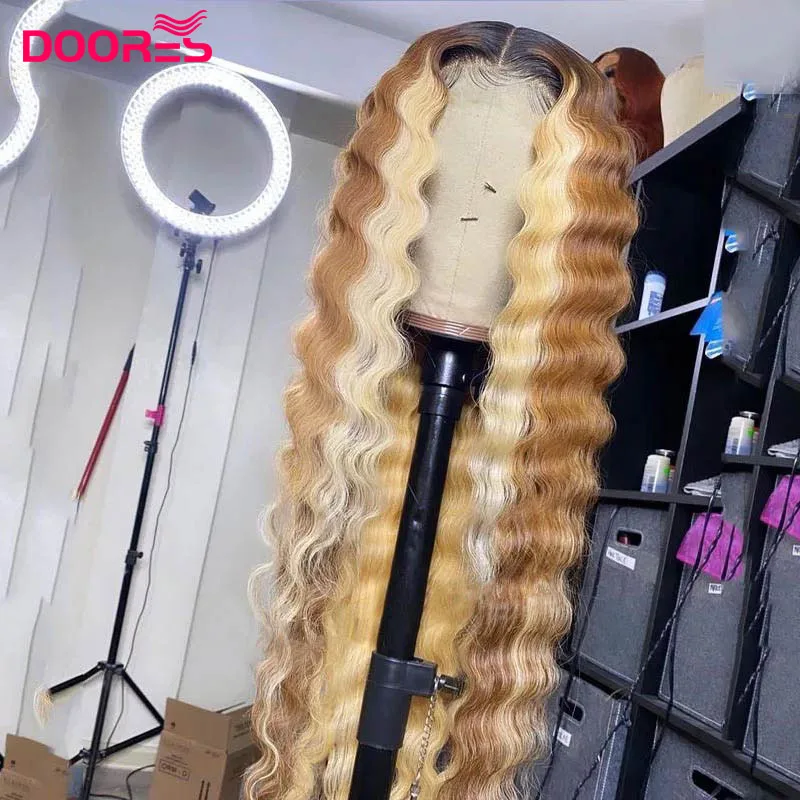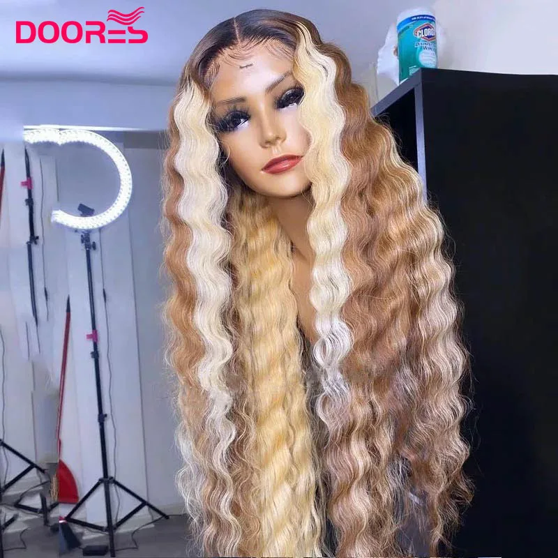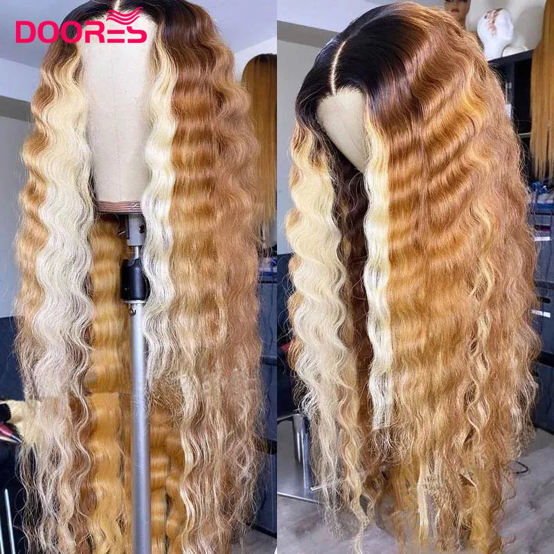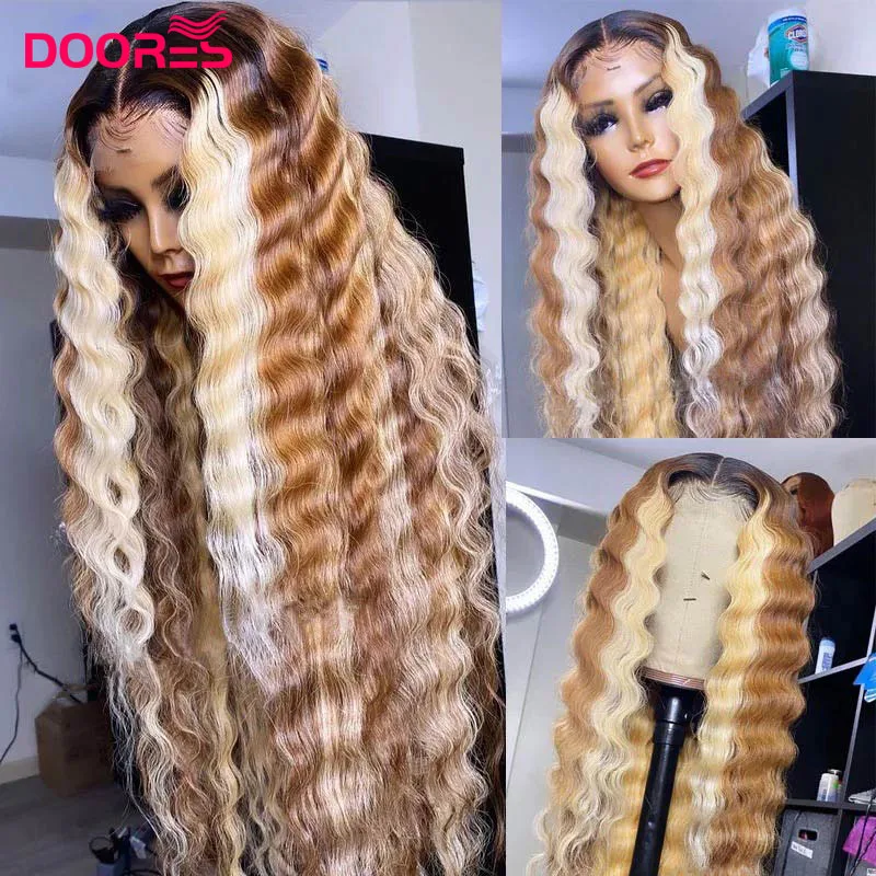 Глубокая волна Выделите Мёд блондинка Цветной парики из натуральных волос для черный Для женщин Синтетические волосы на кружеве парики 613 эффектом деграде (переход от темного к HD прозрачный парики