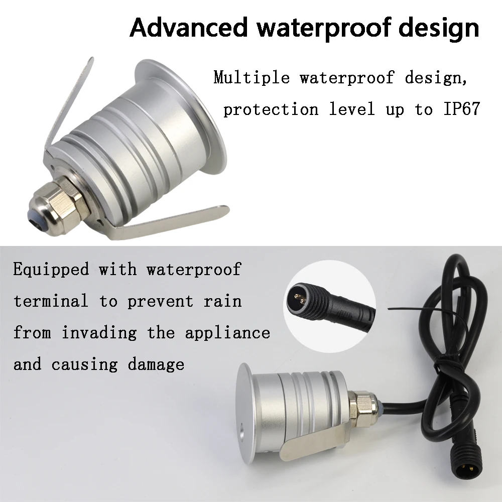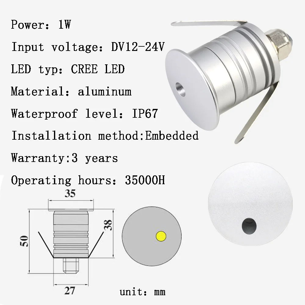 Мощность: 1 ВтСветодиодный: CREE-XTEЦветовая температура: теплый белый (2700-3000K), натуральный белый (4000-4500K), холодный белый (6000-6500K)Другие варианты: красный, зеленый, синийВходное напряжение: DC12V-24VКабель: 12 В постоянного тока с водонепроницаемой клеммой 36 смЛюмен: 95 лмCRI:≥ 80RaСтепень защиты IP: IP67Материал корпуса: алюминий