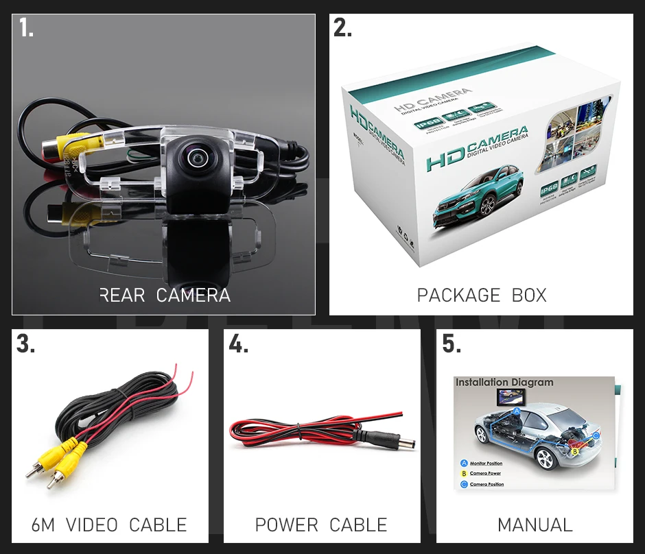 1. Задняя камера2 посылка3. Видеокабель (6 м)4. Кабель питания5. Руководство