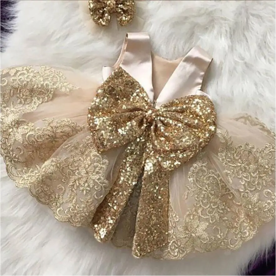 Золотистые блестящие платья с бантом для новорожденных, крестины, п...