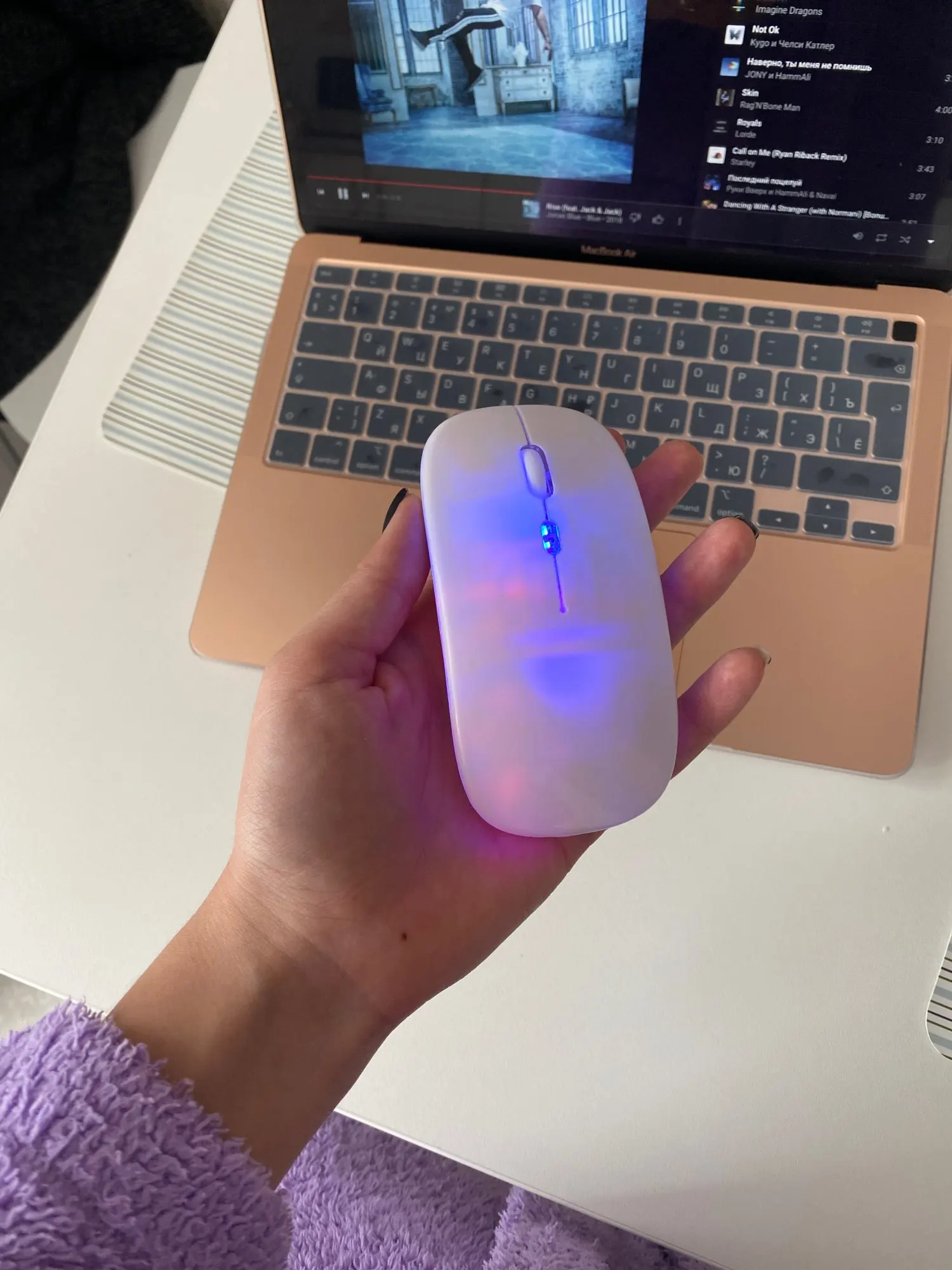 С продавцом не общалась, но посылку он подтвердил очень быстро. Доставка была быстрой. меньше месяца. Посылка пришла на отделение Укрпочты. В коробочке, не помятая, всё хорошо упаковано. Пришла уже заряженая с проводом. Светиться всеми цветами. есть 4 кнопки. Две основные, та что крутиться и по середине дополнительная. На задней панели есть кнопка включить выключить, диод и углубление для блютузного штекера. Работает плавно, не тормозит. Заряжается. Покрытие матовое, сильно не залапываеться. Удобная в руке У меня 10 Виндовс и все работает хорошо. Также проверяла работает хорошо на 7 виндовсе. Цена мышки оправдана. 10/10