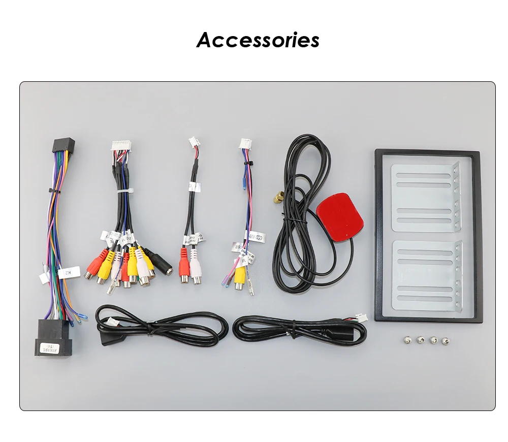 Стерео поставляется с аксессуарами, как показано на изображении аксессуаров, если вам нужен другой провод или аксессуары для установки, вам нужно купить отдельно.