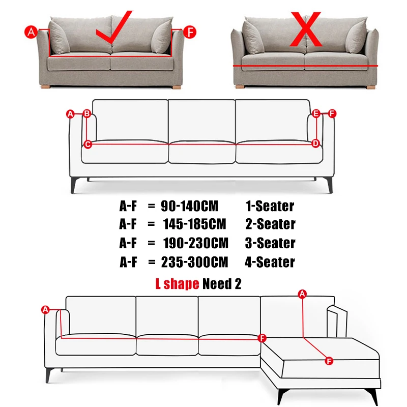 3. Пожалуйста, измерьте свой диван с подлокотниками, затем выберите размер.· 1-местный диван-крышка, подходит для длины дивана должна быть в пределах 90-140 см;· 2-местный диван-крышка, подходит для длины дивана должна быть в пределах 145-185 см;· 3-местный диван-крышка, подходит для длины дивана должна быть 190-230 см;· 4-местный диван-крышка, подходит для длины дивана должна быть 235-300 см.