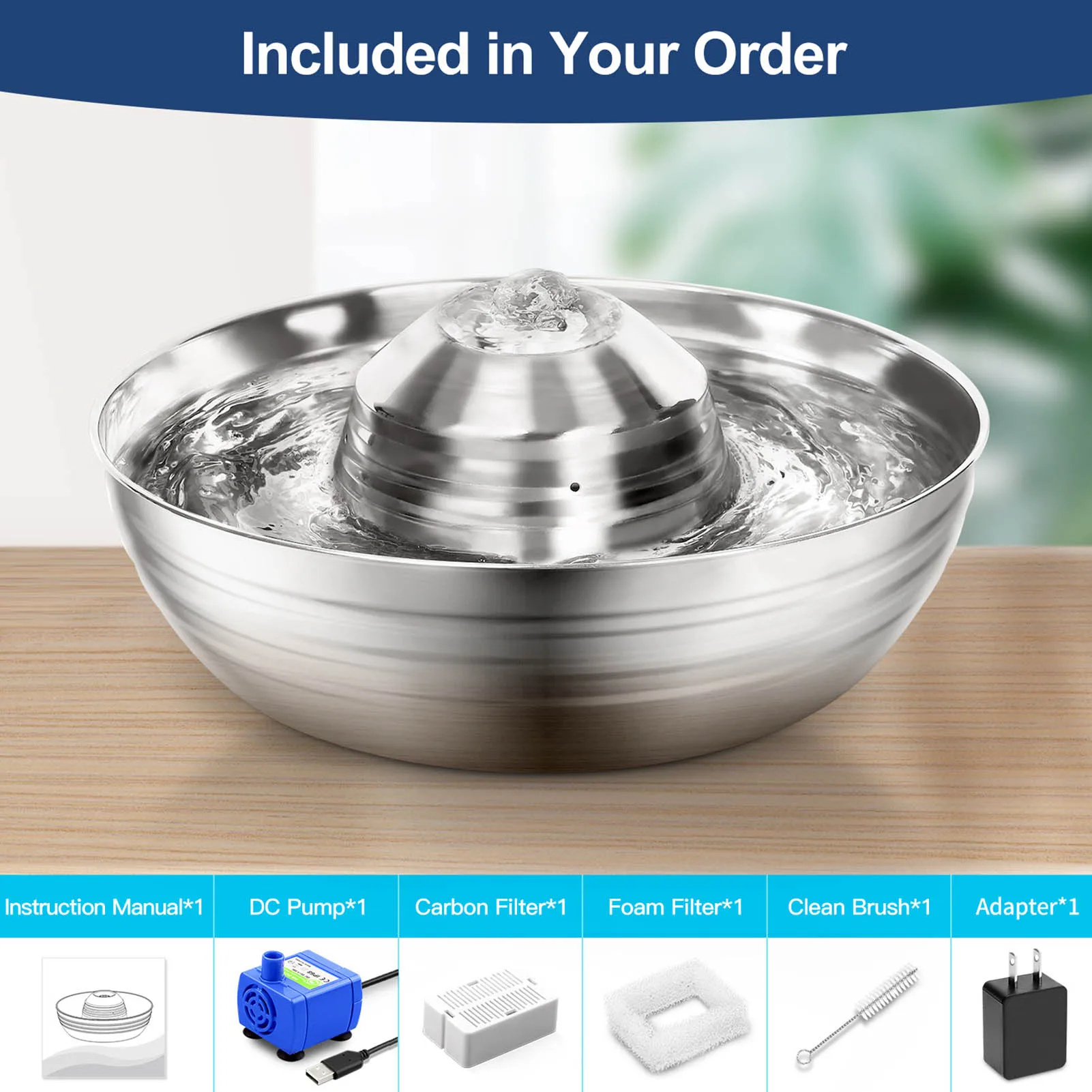 1. 2 л большой емкости, обеспечивают гарантию питьевой воды для домашних животных. 2. 100% SU304 материал из нержавеющей стали, бисфенол свободный, безопасный и экологически чистый. 3. Легко разбирается, легко моется, можно мыть. 4. Ультра-тихий водяной насос, стандартная и высокая конфигурация опционально (непрерывное водоснабжения и нехватки воды. 5. Дизайн водного выхода в стиле фонтана может привлечь домашних животных, чтобы пить больше воды, что способствует энергии.). 6. Открытая Питьевая зона 360 ° подходит для кошек и собак. 7. Питьевая вода также доступна в местах без фонтана для удовлетворения потребностей питьевой воды различных домашних животных и нескольких домашних животных. 8. Конструкция для хранения воды, есть вода для питья, даже если питание выключено. Спецификация: Название: дозатор воды для домашних животных из нержавеющей стали Цвет: нержавеющая сталь Источник питания: 5V1A Мощность: 1,5 W Длина кабеля: около 1,8 м/70,86 дюйма Емкость: 2.0L Материал: нержавеющая сталь 304 Упаковка: коробки Один посылка Размер: около 24,5*24,5*10,4 см/9,64*9,64*4,09 дюймов Один посылка Вес: около 0,8 кг Сертификация: CE/ ROHS/FCC Упаковочный лист: 1 * диспенсер для воды