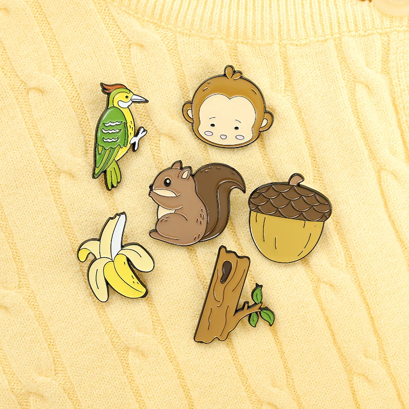 Эмалированные булавки с животными в лесу, обезьяна, банан, белка, сосновые конусы, дятел, значок для багажника, сумка, ювелирные изделия, подарок для друзей