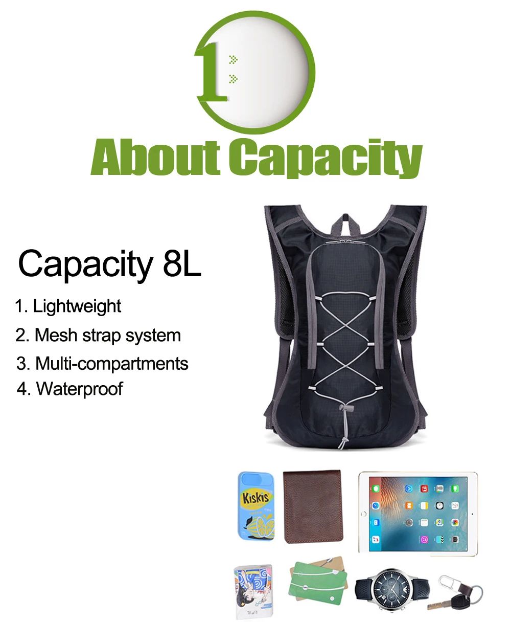8L спортивный рюкзак, он также предоставляет большую запасную комнату для ваших предметов первой необходимости на открытом воздухе, включая дополнительную одежду, спортивное полотенце, ключ для телефона и т. д. храните вещи в порядке и удобнее.