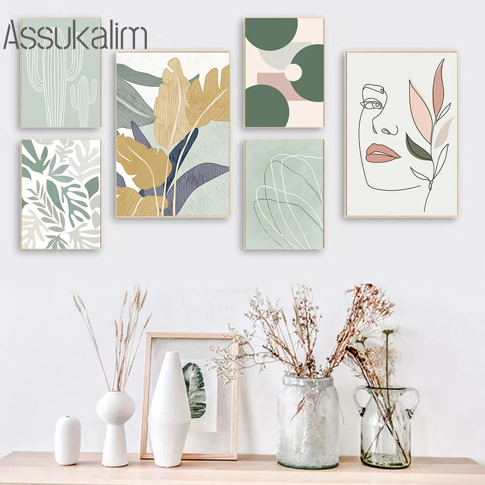 Абстрактный постер на холсте с изображением лица, плакаты, абстракция растений, листья, принты, Минималистичная картина, настенные картины в скандинавском стиле, декор для гостиной