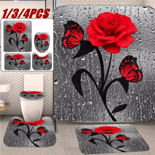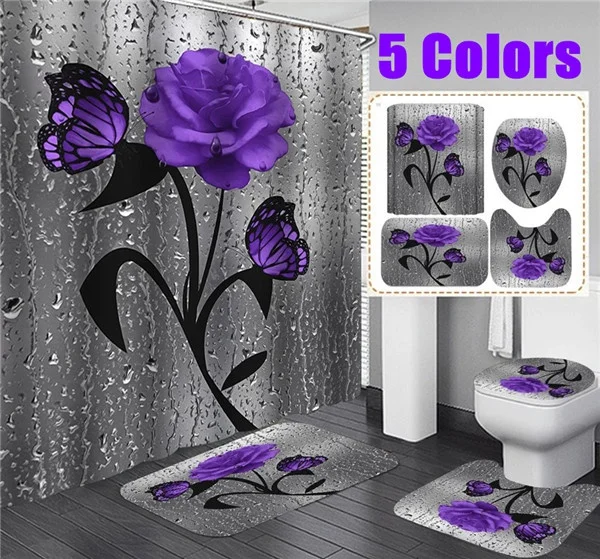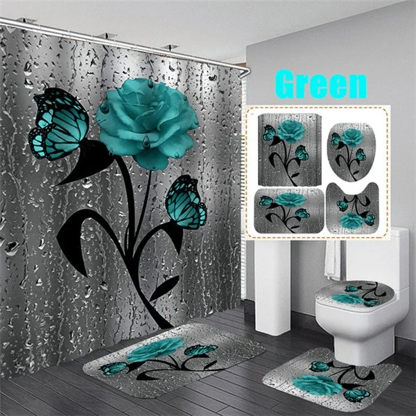 Набор водонепроницаемых Противоскользящих ковриков для ванной комнаты, зеленый, красный, розовый и бабочка, занавеска для душа, подставка под коврик, крышка для унитаза, коврики для ванной