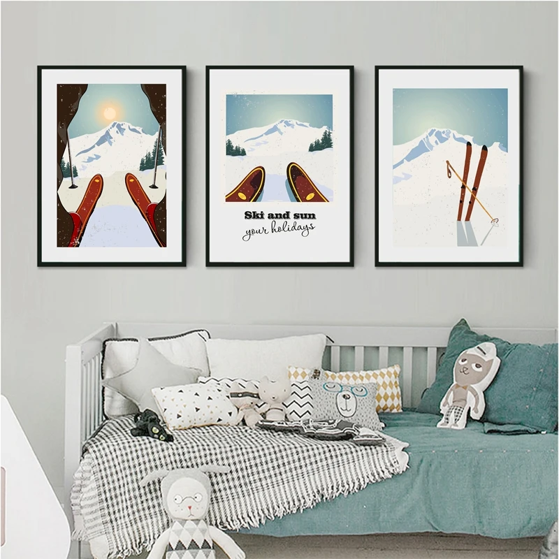 Зимние виды спорта, лыжная фотография, винтажный постер для путешествий, лыжи в снежной горе, зимний Декор для дома