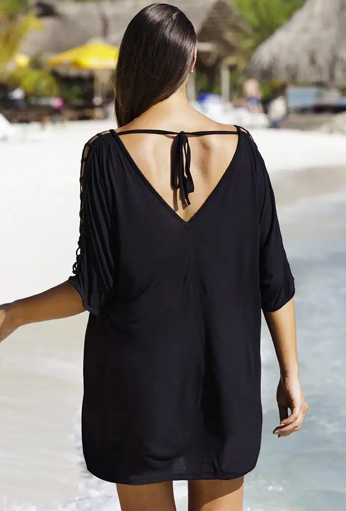 Свободная Пляжная накидка размера плюс, Повседневная Блузка с коротким рукавом, черная пляжная одежда, сексуальная женская накидка для бикини, купальный костюм