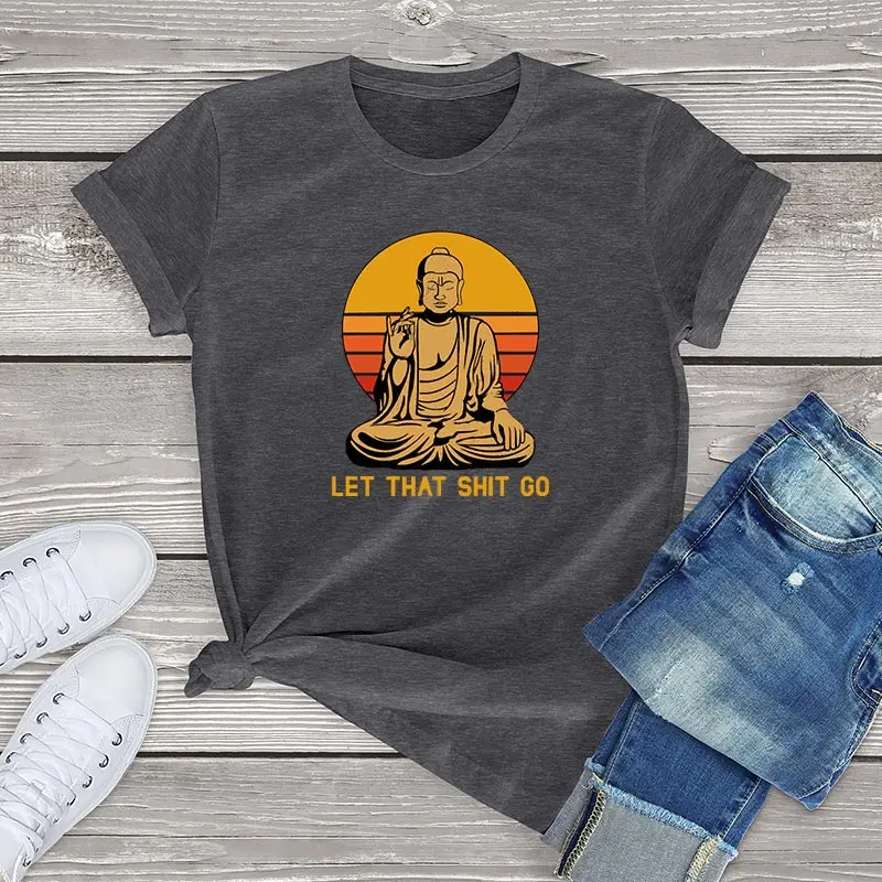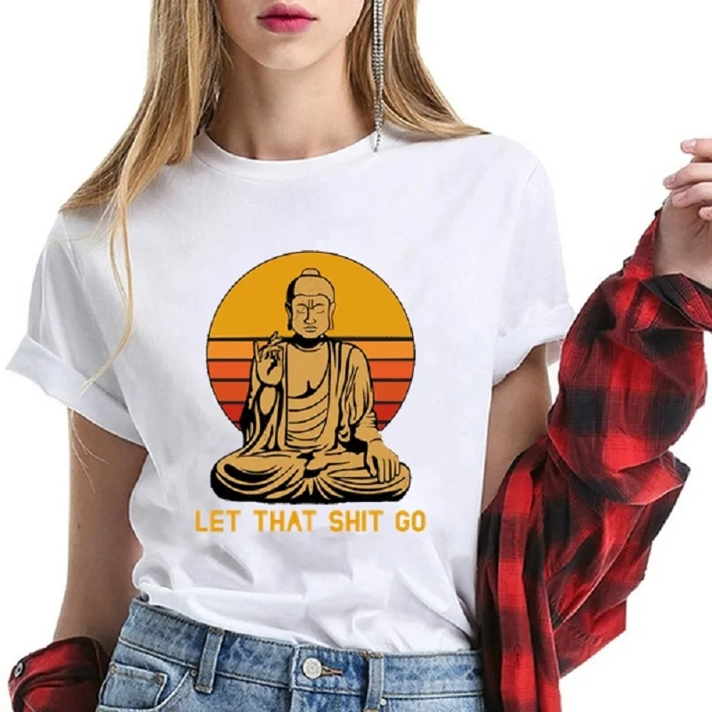 Забавная женская футболка в стиле Харадзюку, Графические футболки Будды с надписью Let That Go kawaii, хлопковые Модные топы для девушек, летний подарок 2021