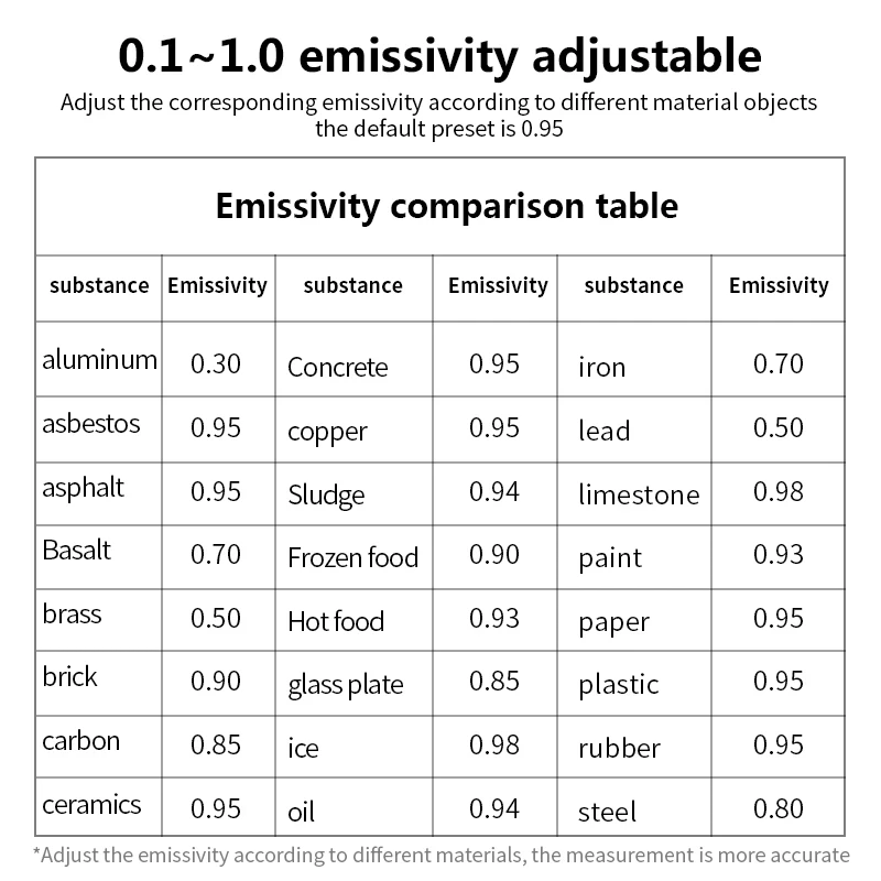 Отрегулируйте соответствующую излучательную способность в соответствии с различными материалами