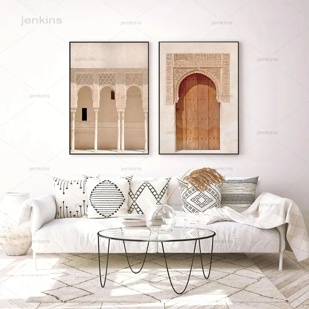 Марокканский двери Wall Art арабских Архитектура холст с каллиграфией картина исламского здания Плакаты и печать, Картина Настенная бохо стиле