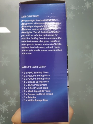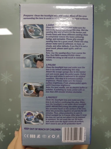 Особенности:-Два способа выбора: ручная или машинная (машинная полировка, как правило, дает лучшие результаты.)-Предназначен для восстановления четкости линз фар, которые стали пожелтевшими, облачными или туманными.-Набор для восстановления линз фар улучшает производительность фар.-Три простых шага: песок, полировка и защита.-Проще, чем Замена старой фары.-Поставляется с простыми в использовании инструкциями.-Комплект для восстановления автомобильных фар не включает в себя бытовую дрель.-Восстанавливает фары, задние фонари, противотуманные фары или направленный свет.-Этот комплект предназначен для восстановления 2 фар.