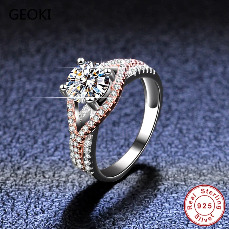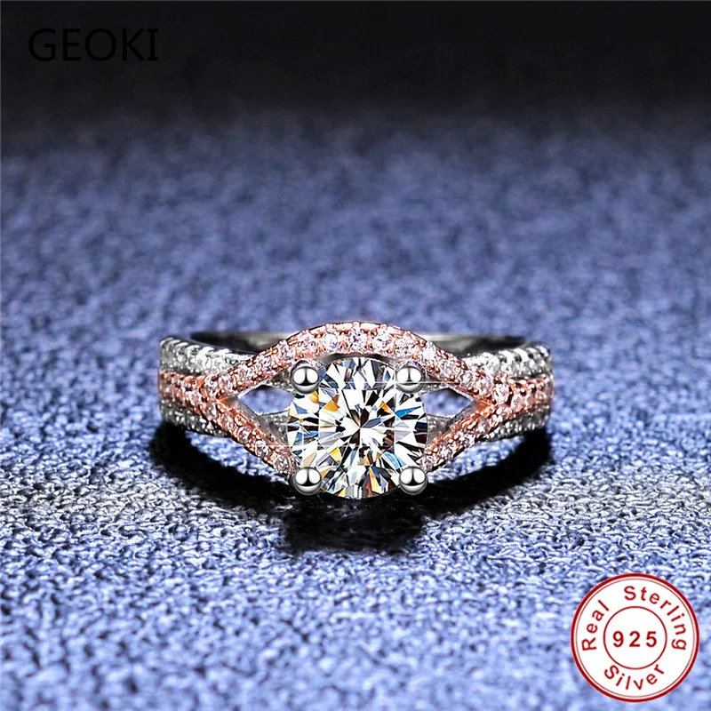 Geoki прошел алмаз Тесты розовым золотом идеальный крой 1Ct D Цвет VVS1Moissanite глаз кольцо роскошные 925 пробы Серебряные вечерние ювелирные изделия