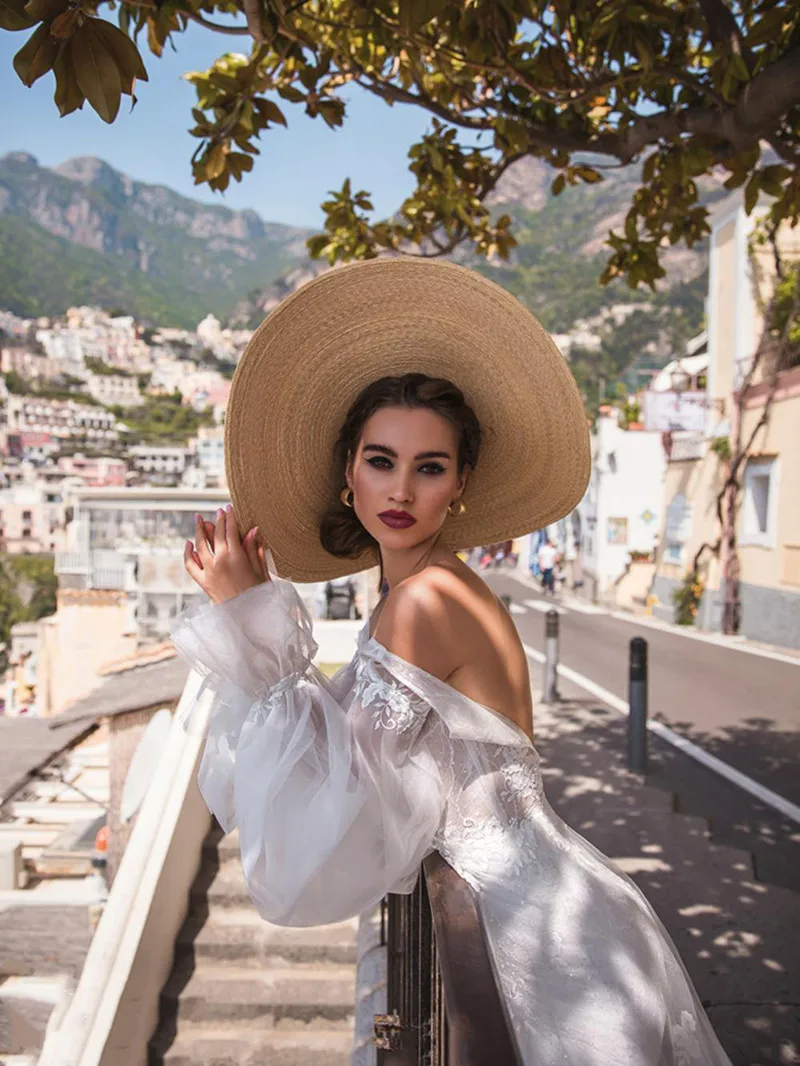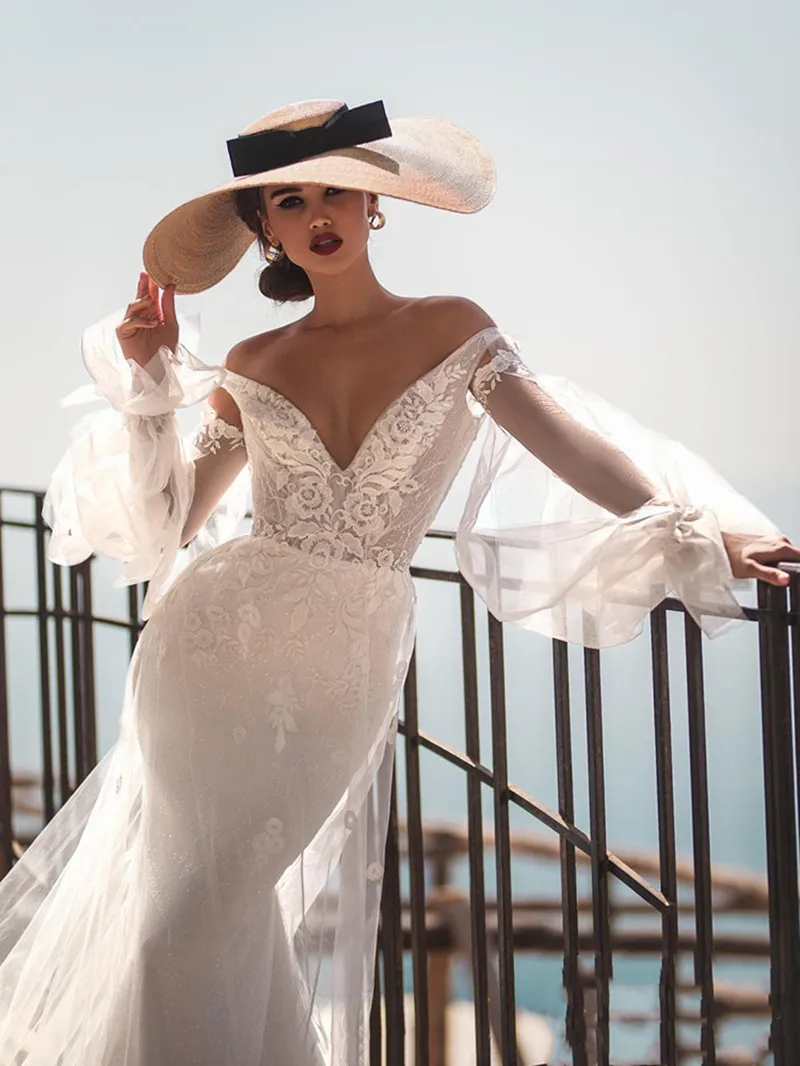 Женское свадебное платье с юбкой-годе, открытыми плечами и шлейфом