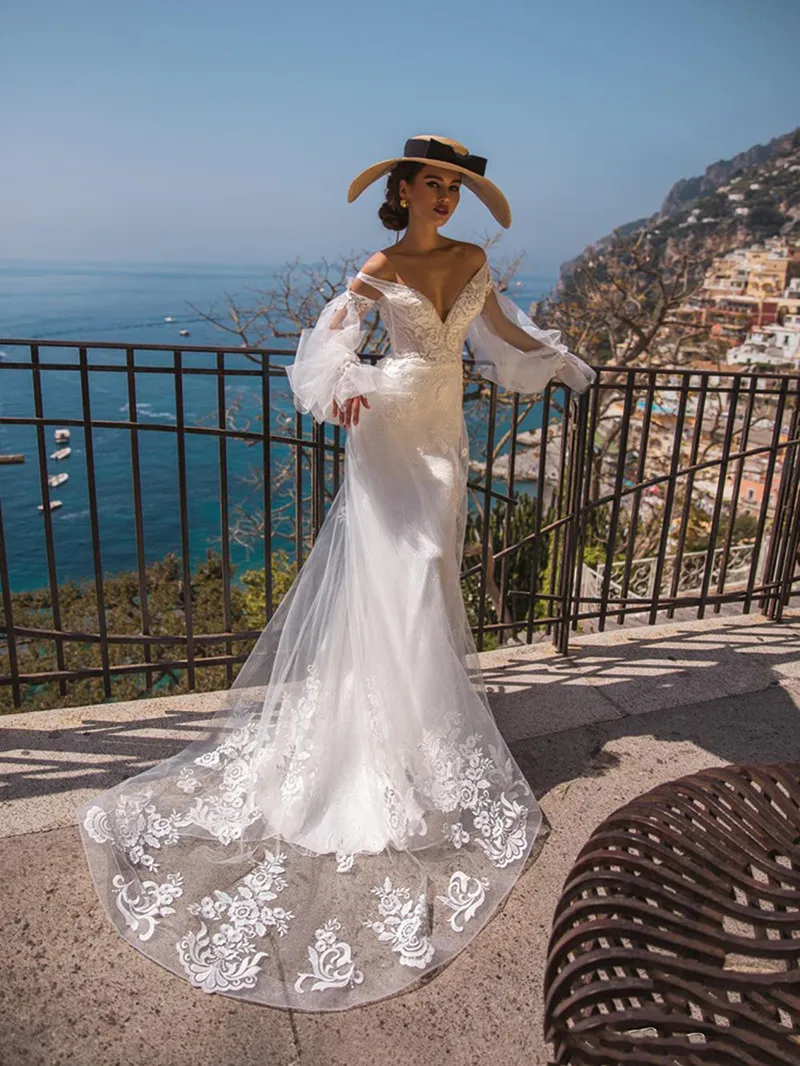 Элегантные свадебные платья русалки с открытой спиной Глубокий v-образный вырез вышивка аппликация Длинные свадебные платья рукав-фонарик кружева поезд размера плюс