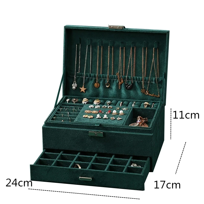 Шкатулка-органайзер женская, трехслойная, с замком, для украшений, кольца, ожерелья, макияжа, зеленые гвоздики