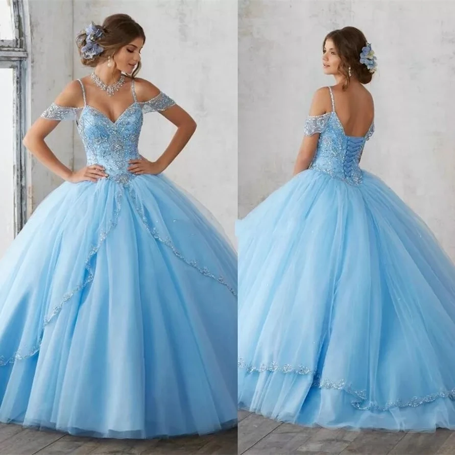 Светильник-голубое платье принцессы Quinceanera 2021 бальное платье на бретелях спагетти с открытыми плечами аппликации блестки милое 15 платье