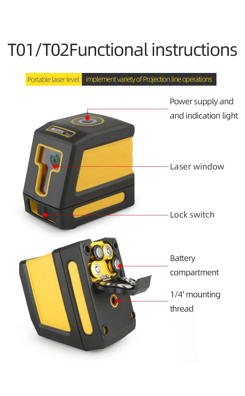 1T01/T02 лазерный уровень (без батареи) 1 Магнитный кронштейн для пользователя на английском языке 1 Руководство пользователя (отправка при выборе) 1 упаковочная коробка 1 сумка