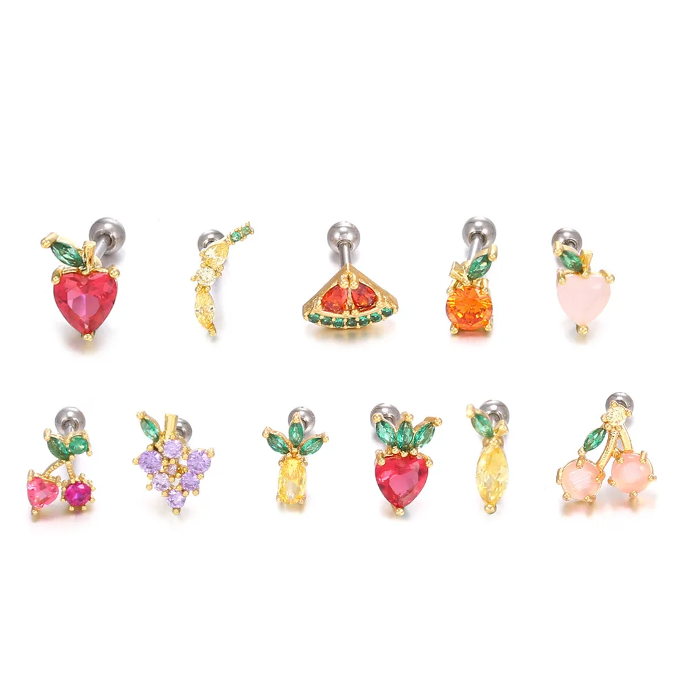 Goth 1 шт. милые серьги для женщин с фруктовым хрящом, Cz кристалл, банан, яблоко, вишня, маленькие серьги-гвоздики, серьги для пирсинга, ювелирные изделия