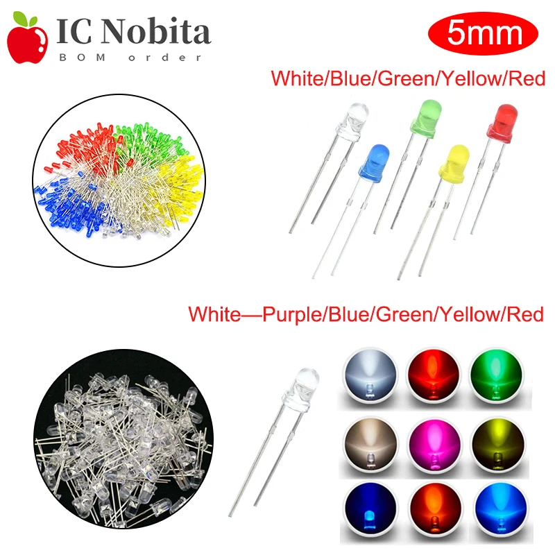 100 шт. 5 мм светильник ные диоды круглые F5 красный зеленый оранжевый фиолетовый желтый синий белый розовый набор светодиодов для самостоятельной сборки хорошего качества