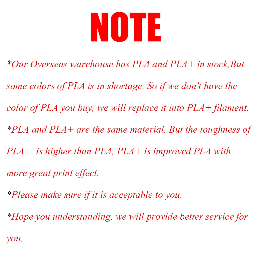 ПримечаниеНаш зарубежный склад имеет PLA и PLA + в наличии. Но некоторых цветов пла нехватает. Поэтому, если у нас нет цвета PLA, который вы покупаете, мы заменим его на PLA + Филамент.PLA и PLA +-это один и тот же материал. Но прочность PLA + выше, чем PLA. PLA +-Улучшенный PLA с большим эффектом печати.Пожалуйста, убедитесь, что это приемлемо для вас.Надеемся на ваше понимание, мы предоставим вам лучший сервис.