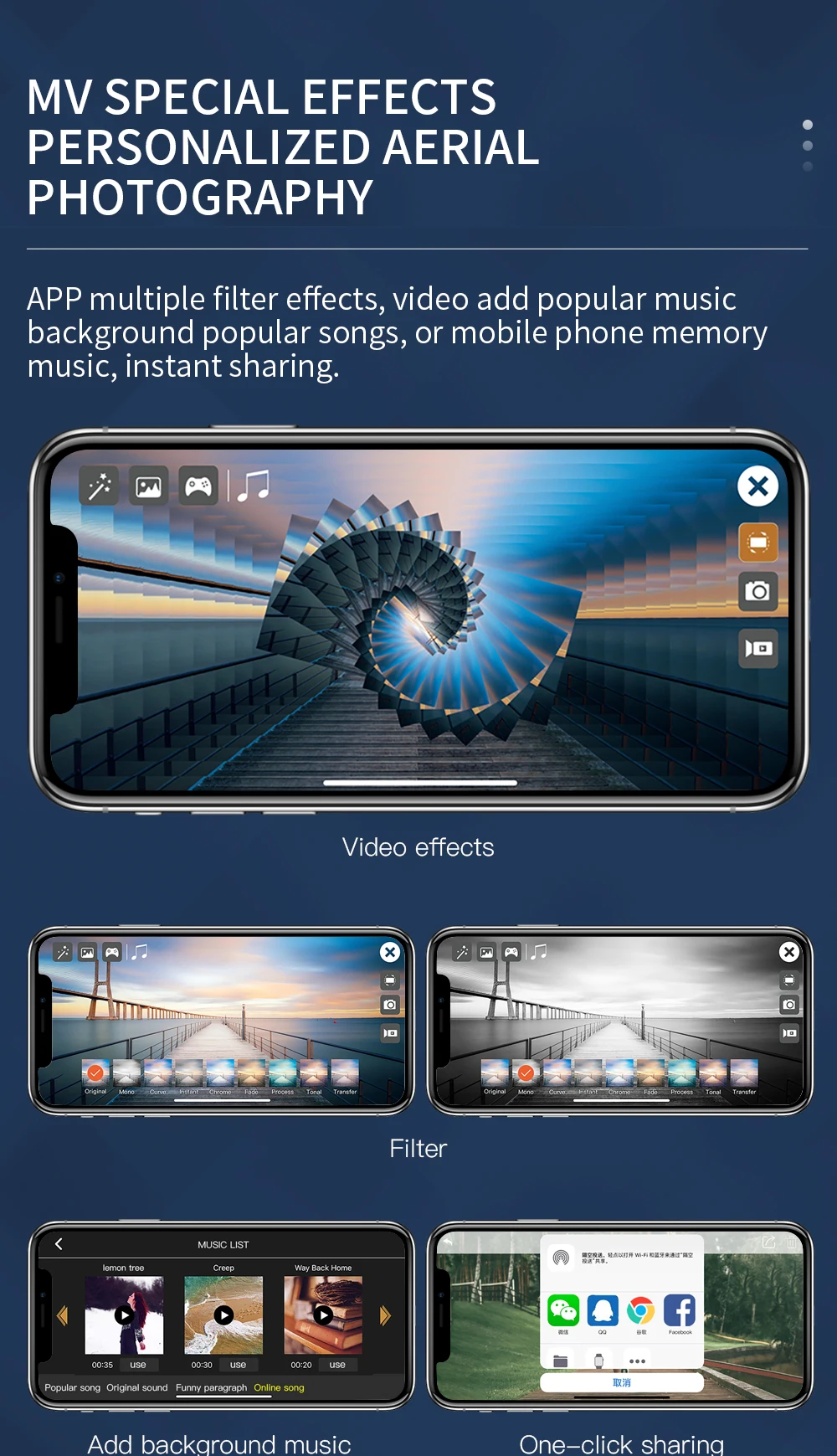 Характеристики MV: фильтры, видеоэффекты, фоновая музыка, обмен фото/видео