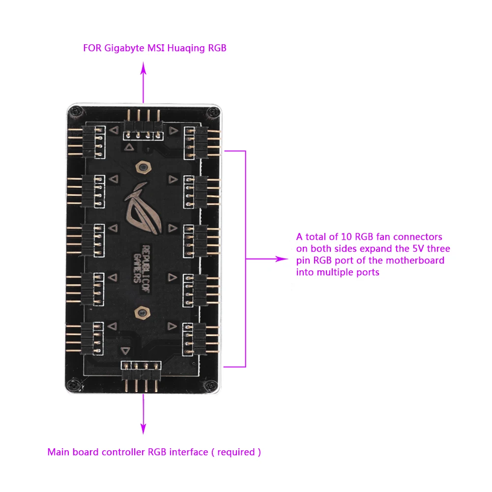 5V 3Pin концентраторОписание:1. Поддержка материнской платы ASUS, MSI, Gigabyte, ASRock 5V/3Pin D-RGB интерфейс управления освещением через управление материнской платой, может синхронизировать освещение с другими продуктами D-RGB.2. Есть пять наборов вентиляторов слева и справа для легкой установки, создавая аккуратное и аккуратное компьютерное пространство.3. Длина линии составляет 50 см, поэтому игрокам больше не придется беспокоиться о коротких линиях.Спецификация:Количество портов вентилятора: 10Интерфейс: 5 В/3pinИнтерфейс питания: интерфейс питания SATAДлина линии интерфейса: 50 смФиксированный тип: фиксированная клейкая наклейкаТип материала: акриловая доска 3 мм12V 4Pin концентраторОсобенности:Используется для расширения интерфейса RGB на материнской плате. Один интерфейс RGB можно разделить на десять, который используется для равномерного управления несколькими вентиляторами и лентами на светильник, поддерживающими затемнение материнской платы.12V 4-контактный десять-канал RGB расширения концентратор подключается к 4-контактный интерфейс RGB материнской платы компьютера.Задняя часть монтажной платы имеет клей, чтобы выбрать место установки в соответствии с вашими потребностями.Спецификация:Интерфейс RGB: 12 В 4pinСоответствующий интерфейс: материнская плата 12 В RGB интерфейсПодключение RGB: 10Тип материала: акриловая доска 3 ммРазмер: 88X38X14 ммДлина линии: 50 см/19,69"Меры предосторожности:1. Этот концентратор не может улучшить дополнительный источник питания интерфейса RGB материнской платы. Как правило, интерфейс RGB может обеспечить не менее 12 Вт источника питания. Может быть подключен к 10 вентиляторам Aura для равномерного затемнения. Для дома сложно подключить светильник RGB общей длины более 1 м. После перегрузки нагрузки интерфейса светильник будет затемнен и количество устройства должно быть уменьшено.2. Проводка: Помните, что стрелка на вилке соответствует rgb-контакту 12 В.3. Контакты стандартного интерфейса RGB являются круглыми контактами. Индивидуальный интерфейс блока охлаждения воды поддерживает Диммирование материнской платы требует квадратного контакта. Два контакта не являются универсальными. Пожалуйста, подтвердите, поддерживает ли ваша материнская плата его при покупке.4. Функция этого концентратора заключается в том, чтобы расширить разъемы RGB, не источник питания для вентилятора.Примечание:1. Из-за различных настроек монитора и светильник эффект, фактический цвет элемента может быть s светильник ly отличается от цвета, представленного на снимках. Спасибо!2. Возможны отклонения в 1-3 мм вследствие измерений вручную.